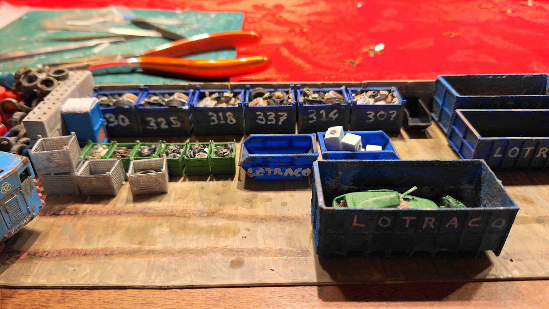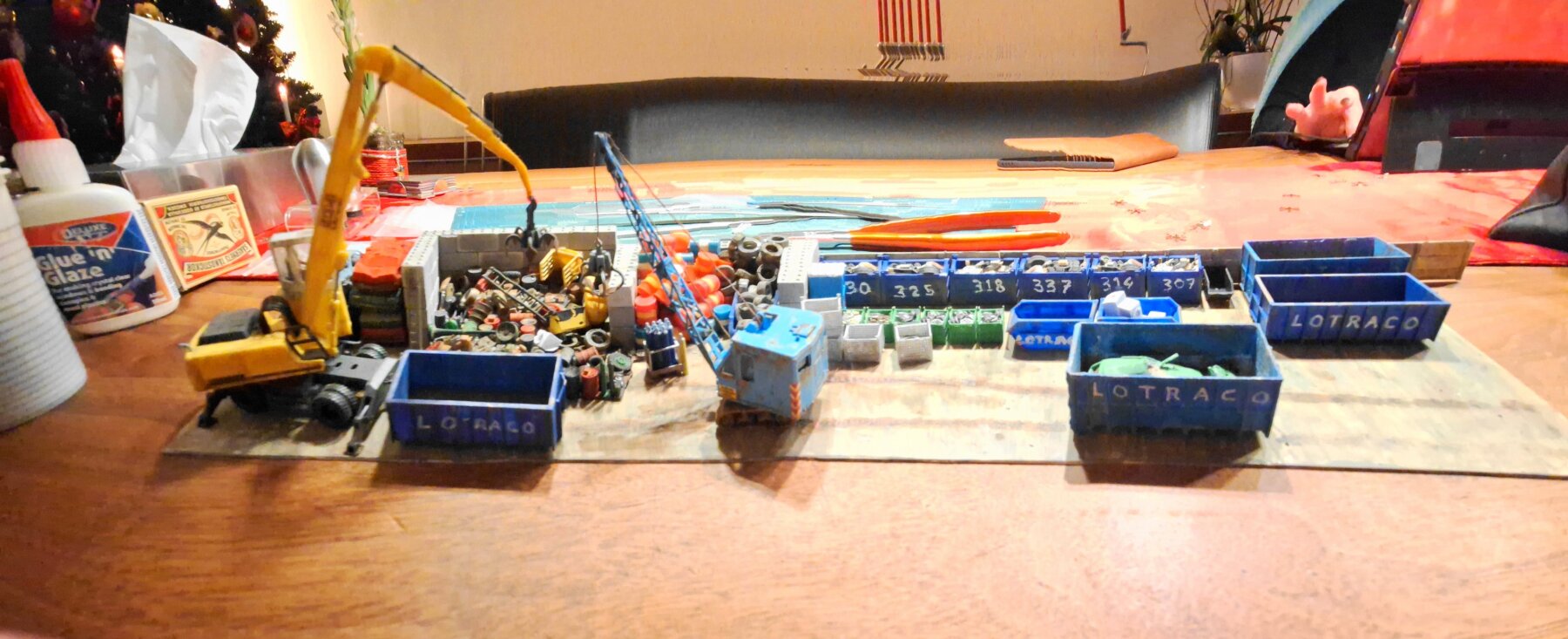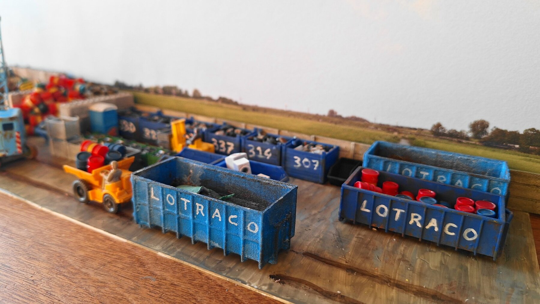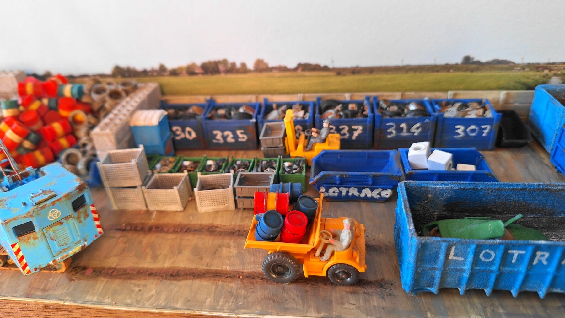 De Kibri Liebherr 934, met op de achtergrond geprinte sloopauto's. De beton lego blokken bakken met los schroot, vaten en draadrollen. De oude Adelheid Krupp kraan van Wiking als backup.