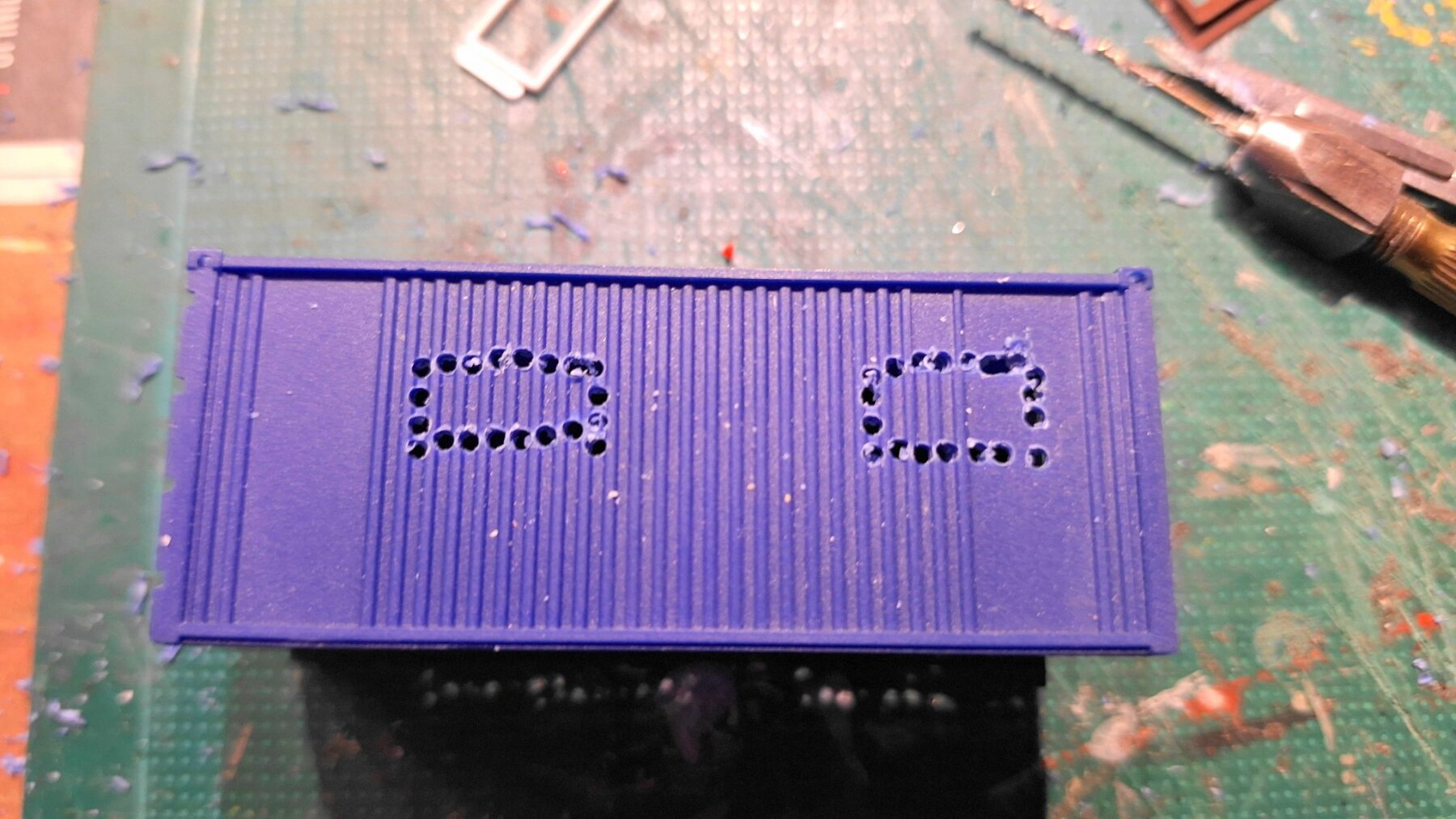 Eerst wat ramen en een deur zagen. Voorboren en met een scalpel de gaten pas maken voor de kozijnen uit de rommeldoos