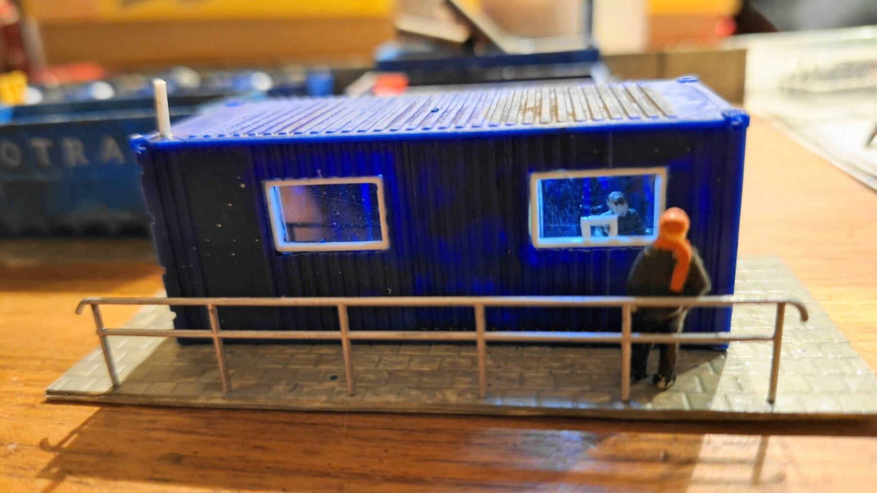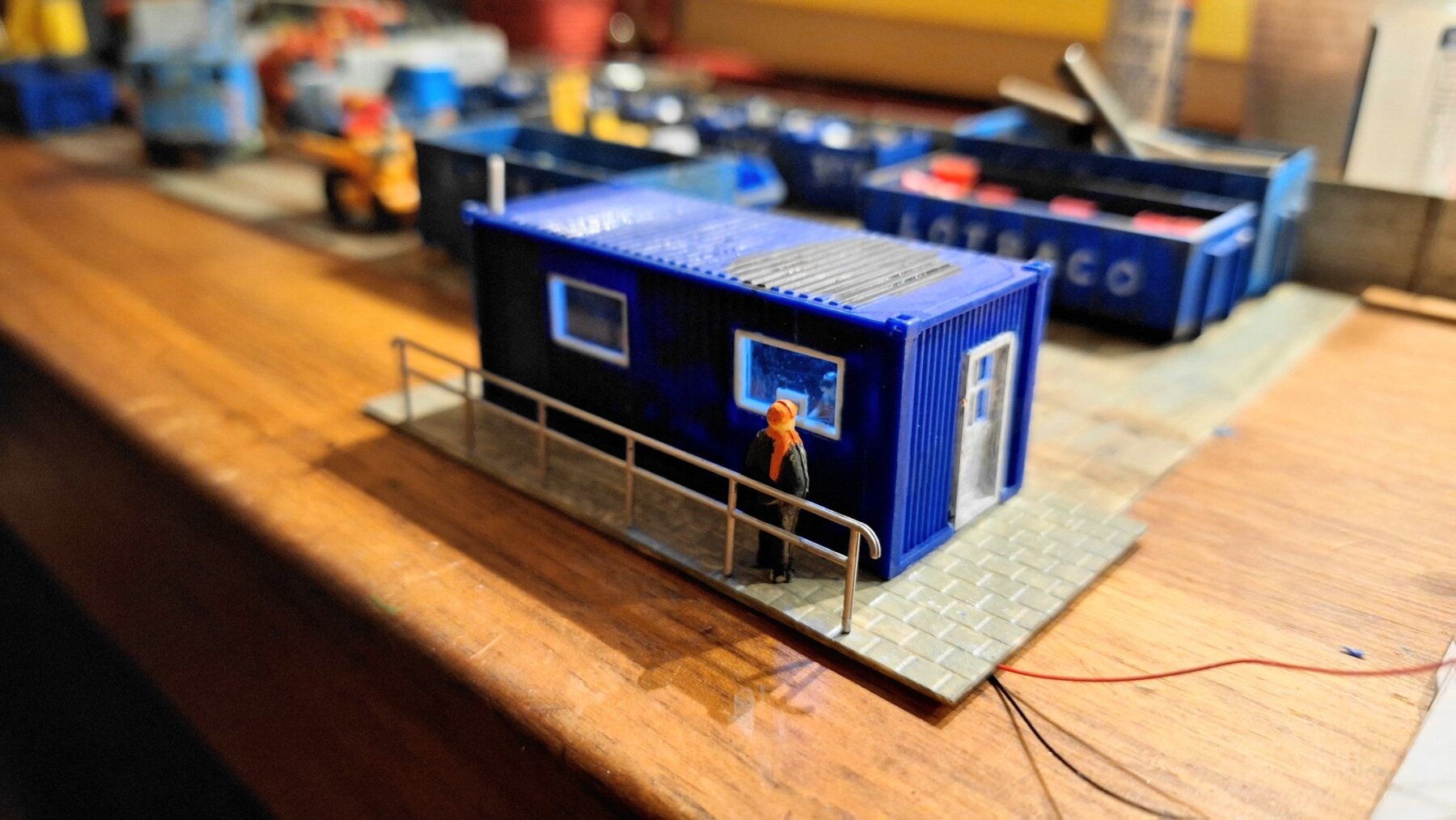 Schoorsteen op de container voor de koude tijden. Leuning en schoorsteen een kwastje allu kleur gegeven. Uiteinde moet nog ff zwart worden. Misschien nog een airco maken, het is er anders in de zomer niet uit te houden