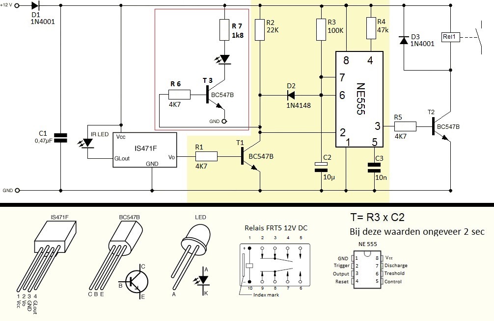 . De condensator ontlaadt via r1 en houdt de transistor langer open. Mijn keerlus module gebruikt dat.