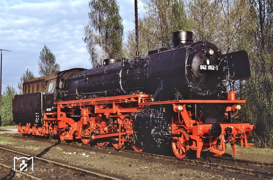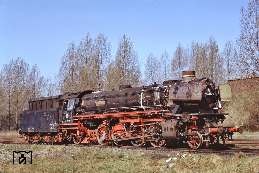 Nachdem 042 052-1 auch eine (fast komplette) Neulackierung erhalten hatte, steht sie nun im Bw Braunschweig zur Rückfahrt nach Rheine bereit. (16.04.1974) Foto: Dr. Uwe Knoblauch