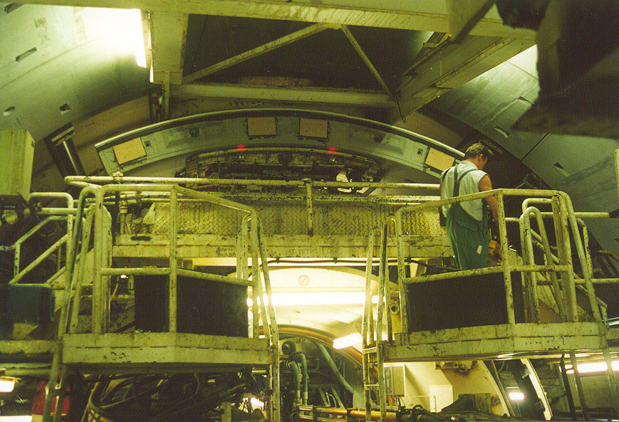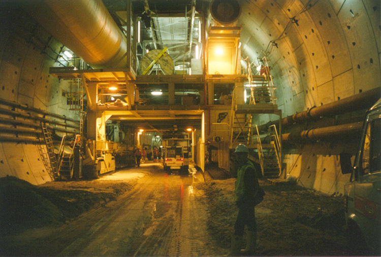 Achterzijde TBM Groene Hart Tunnel (mei 2002): leidingen en aan- en afvoerbuizen hebben vaak een kleur, de rest is wit. (ja, in het begin dan, als ze eenmaal aan het boren zijn worden er niet veel meer gepoetst