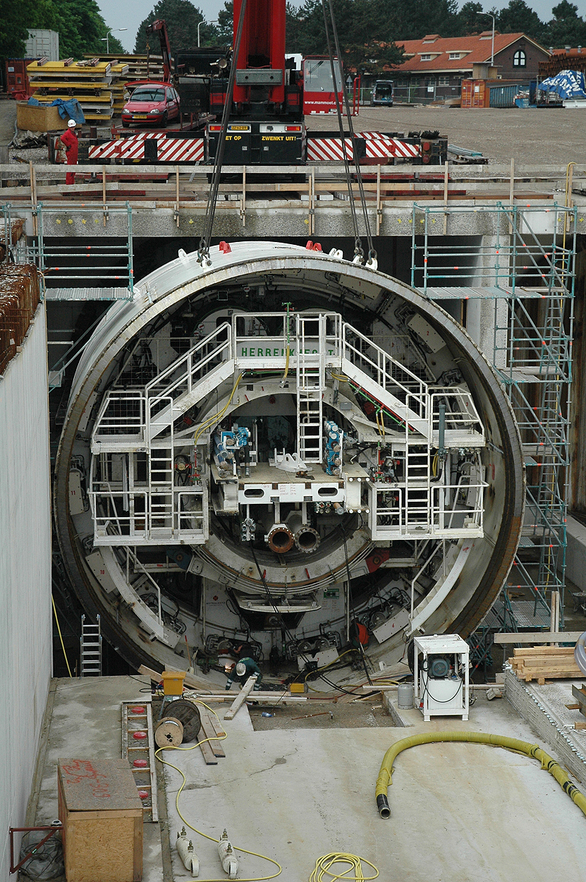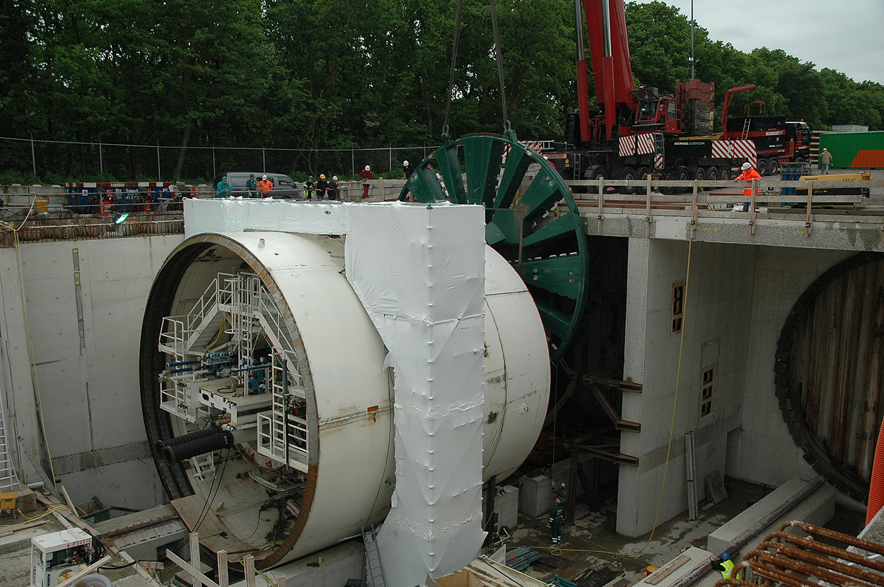 Hubertustunnel, Den Haag (mei 2006): eerste deel van de TBM tijdens het inhangen van het boorschild