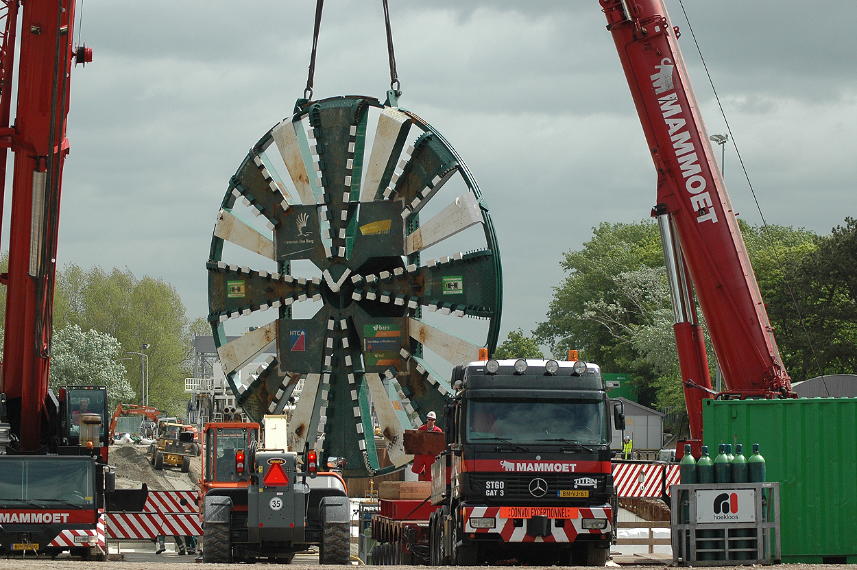 Hubertustunnel, Den Haag (mei 2006): een deel van de trein van TBM wordt de put ingelaten, zichtbaar is onder andere de container vanwaaruit de TBM bestuurd wordt.