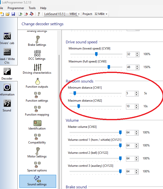 Even in de gratis ESU-software een V3.5 project aangemaakt, en dan zie je op het tabblad Sound settings het volgende. Dat zijn de default waardes. En dat komt aardig overeen met jouw 6 a 7 seconden. Even de waarde in CV61 en 62 vergroten, en je bent van je probleem af.