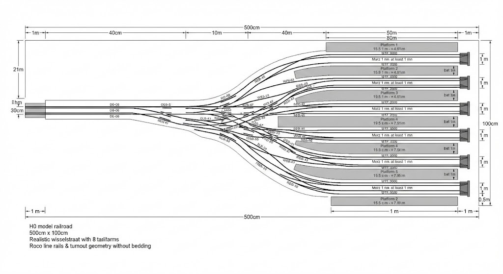 Genereer alsjeblieft een afbeelding van een baanplan van een modeltreinbaan in schaal H0. De afmetingen bedragen 500cm lengte en een breedte van 100 cm. De layout is gebaseerd op een dubbelsporige lijn met een kopstation, als eindpunt van die lijn. Deze sporen lopen recht over de lange zijde van 500cm. Kunnen rondrijden is niet wenselijk. Aan deze dubbelsporige lijn wil ik graag in totaal 8 sporen die grenzen aan een perron. Elk spoor aan de perrons moet aansluiten op het dubbele spoor met een realistisch ogende wisselstraat. Van deze 8 sporen wil ik er alle 8 als kopspoor toepassen met een stootblok aan het einde. Voor de rails en de wissels gebruik standaard geometrie van Roco line zonder bedding. Het geheel moet er realistisch uitzien qua verhoudingen. De sporen langs het perron moeten minimaal een meter lang zijn.
