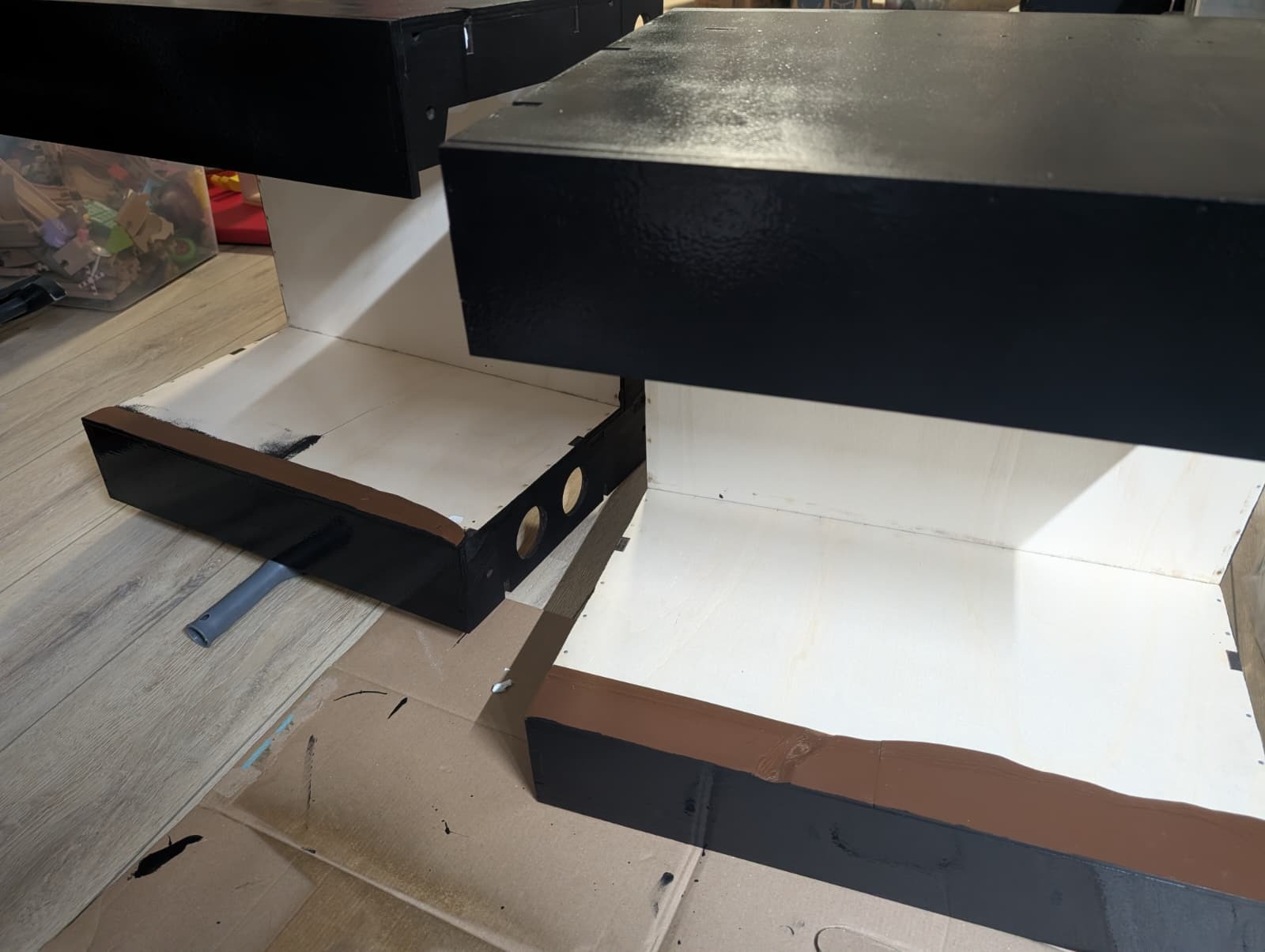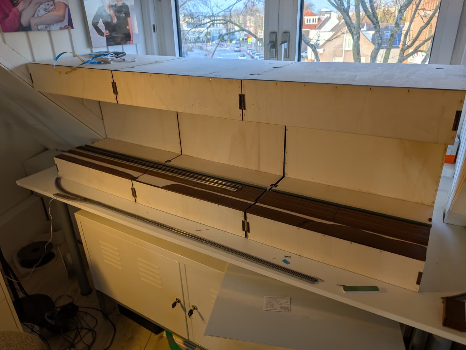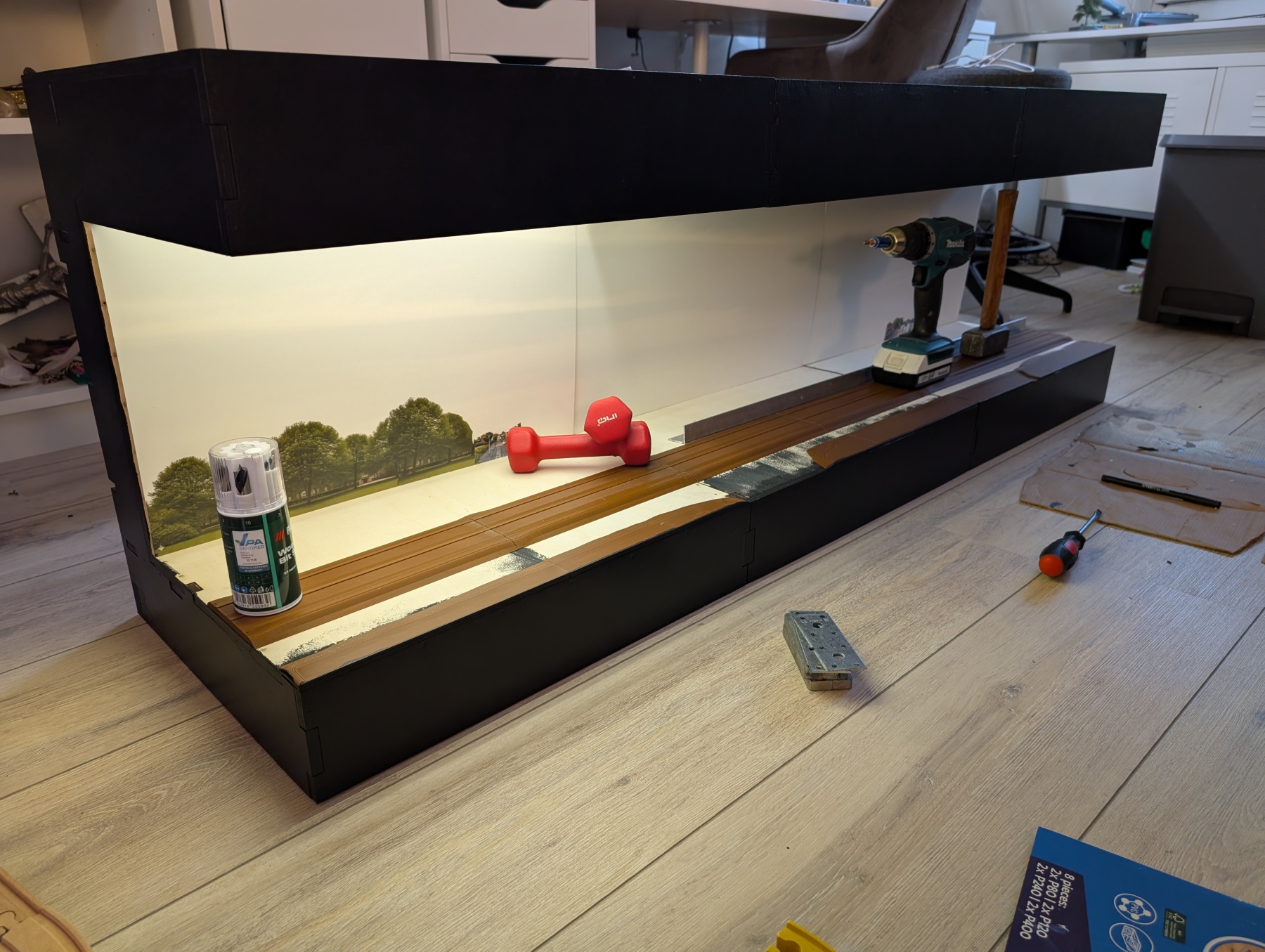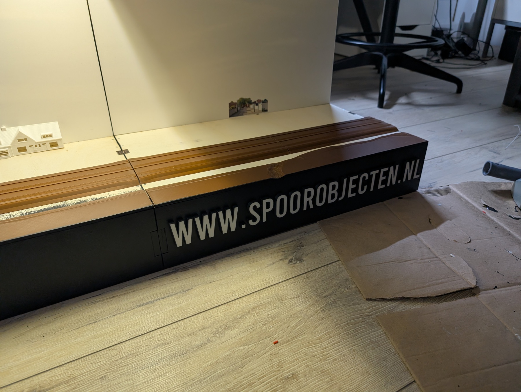 Ik denk dat je zult zien dat de kap van de modulebakken wat te hoog gaan voelen voor je kleine schaal. Er zal heel veel leegte zijn en de scene loopt het risico weg te vallen in de relatief grote bakken. Ik weet dat het niet mogelijk is om de kap te verlagen, maar je zou nog kunnen overwegen architectenkarton aan de boven-voorkant te bevestigen, die meer naar beneden uitsteekt dan zoals de onderrand nu is. Met het verticale schuiven van het karton kun je een beetje experimenteren welke "laagte" het beste werkt. Het is net als het kaderen van een schilderij. Als het een schilderij is waar de nadruk op de lucht licht, zal het kader groot zijn. Maar de aandacht zou hier op je scene moeten liggen. In mijn ervaring komt het kaderen op gevoel aan en is eigenlijk alleen maar te bepalen in het echt en moeilijk in het digitale ontwerp.
