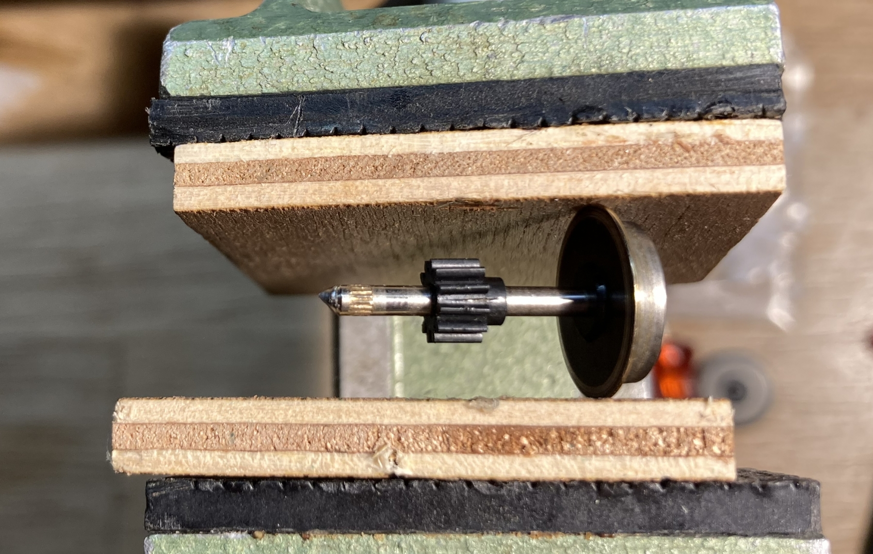 Nu is ook een kraag gebruikt maar is de as bijna op zijn kop gehouden, met de soldeerbout aan de onderkant. Met als doel dat de warmte van de soldeerbout beter naar boven trekt. Ook door de lucht, zo bleek; een deel van het tandwiel is gesmolten .
