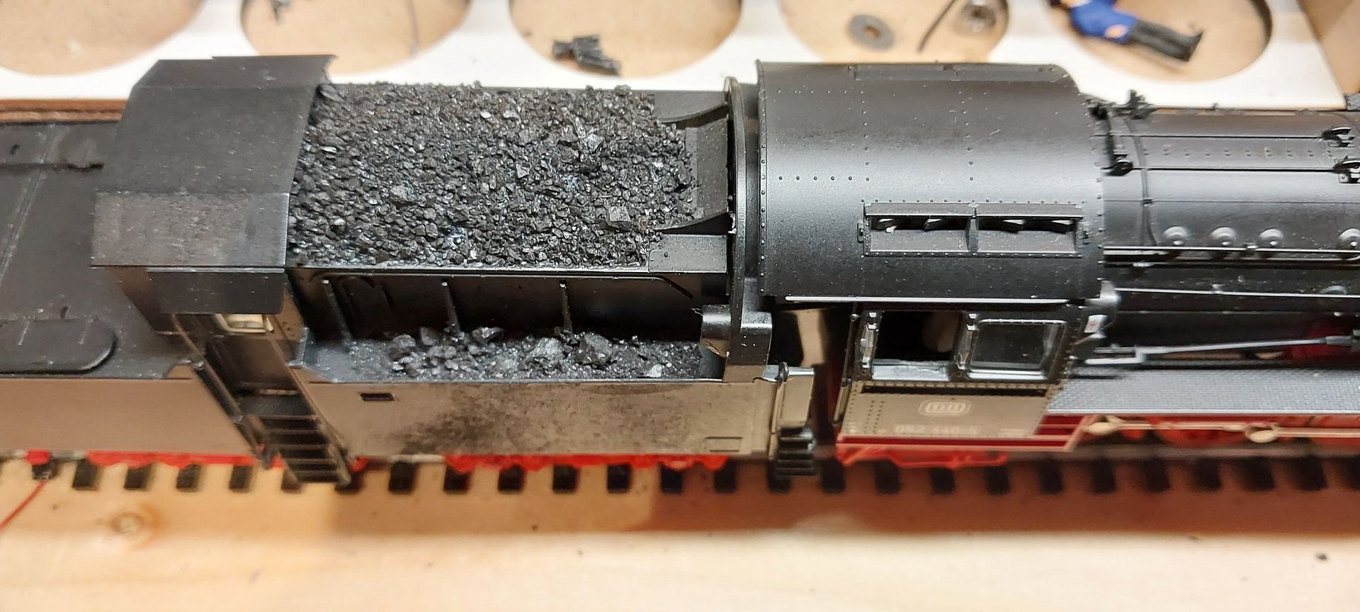 Personeel zit er in, kolen in de tender en de bufferhulzen en buffers in de verf gezet.