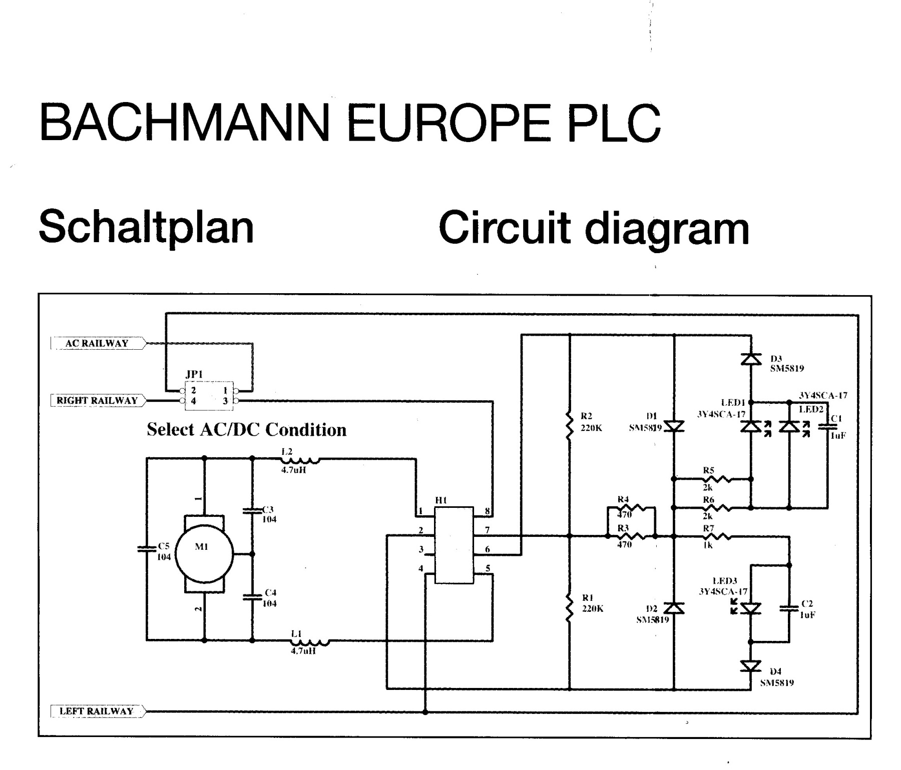 De loc is dus digitaal voorbereid maar heeft een brugsteker (H1 in het schema). Ik heb de "jumpers" voor het omschakelen tussen AC en DC niet gevonden, ook niet in de loc. Ik neem aan dat die alleen in een AC-versie van het model zit. De spanning van de wielen komt netjes binnen op poot 4 en 8 van de brugsteker.