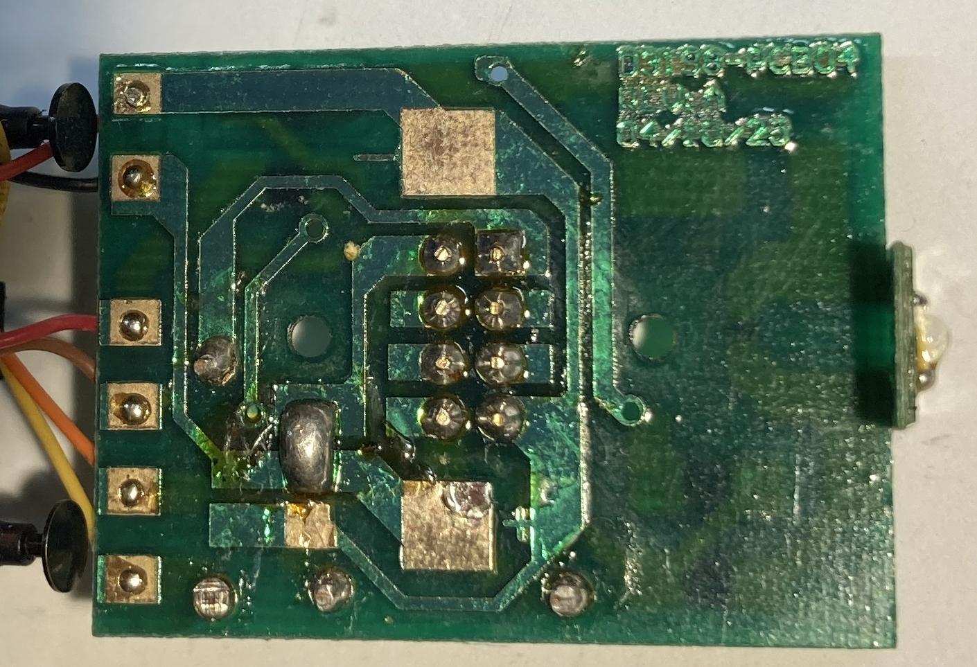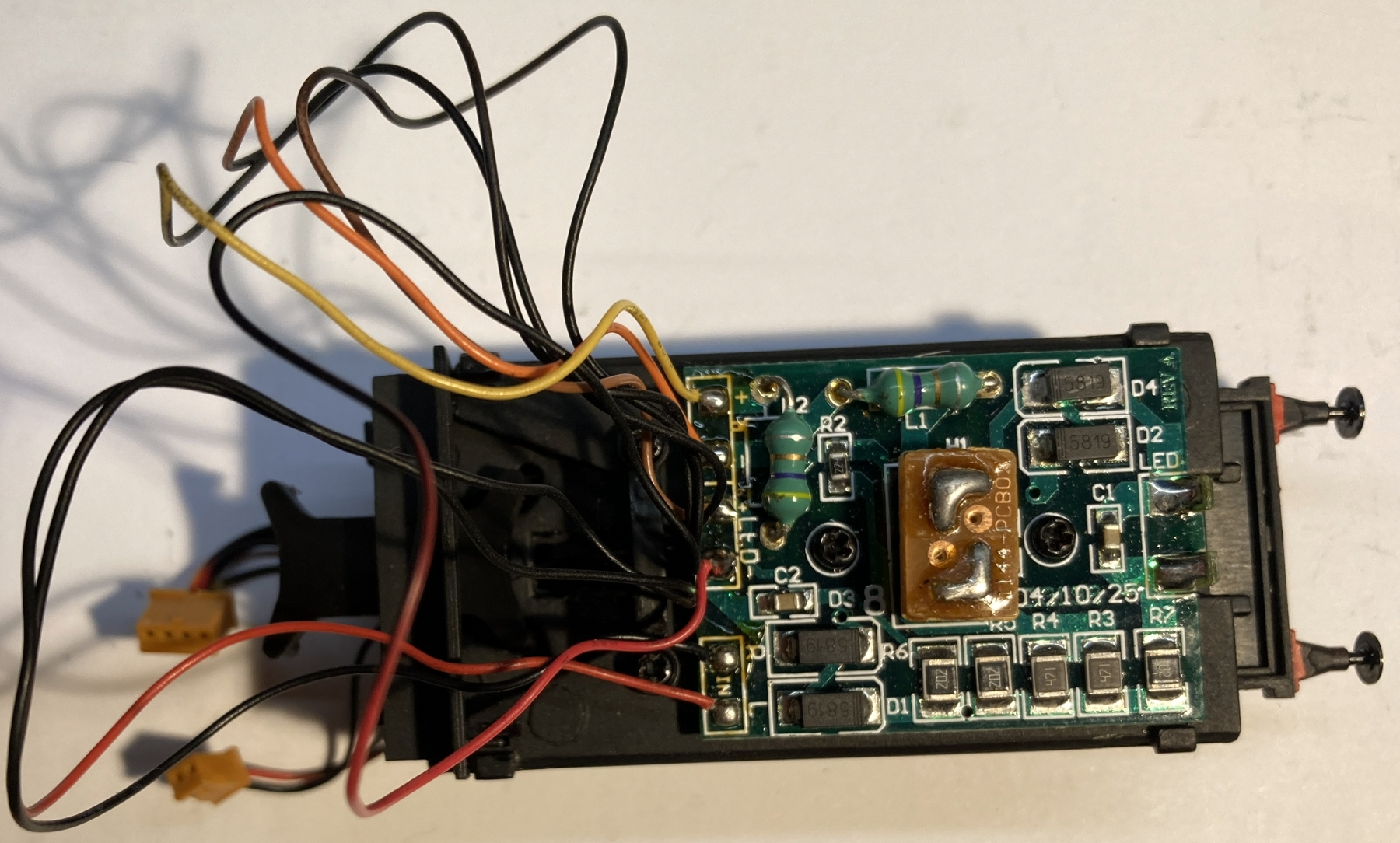 Achteruit loopt de motor, bij toenemende spanning, steeds langzamer en de LED voor de sluitseinen begint zachter te schijnen en te knipperen. Erger is dat twee diodes op de printplaat in de tender erg heet worden! Er lijkt ergens kortsluiting te zitten, maar in één rijrichting. Ik heb een tijdje naar de print zitten turen maar kan niets ontdekken dat - verkeerd - aangepast is door een vorige eigenaar. En nu weet ik even niet verder.