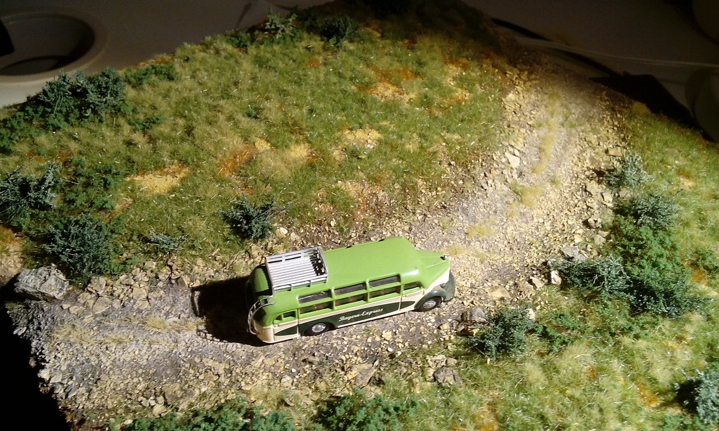 Op onderstaande dio van 20 x 20 cm heb ik 1 2 en 4 mm vezels verbruikt. De bus is in schaal 1 : 160.