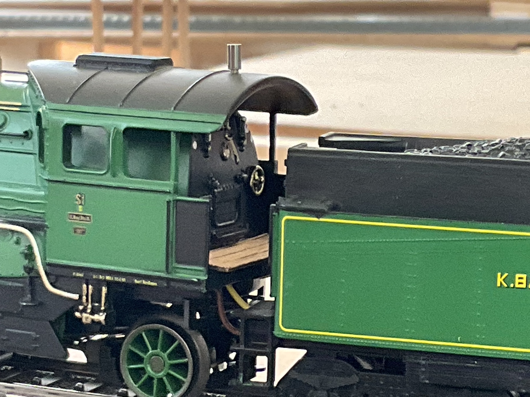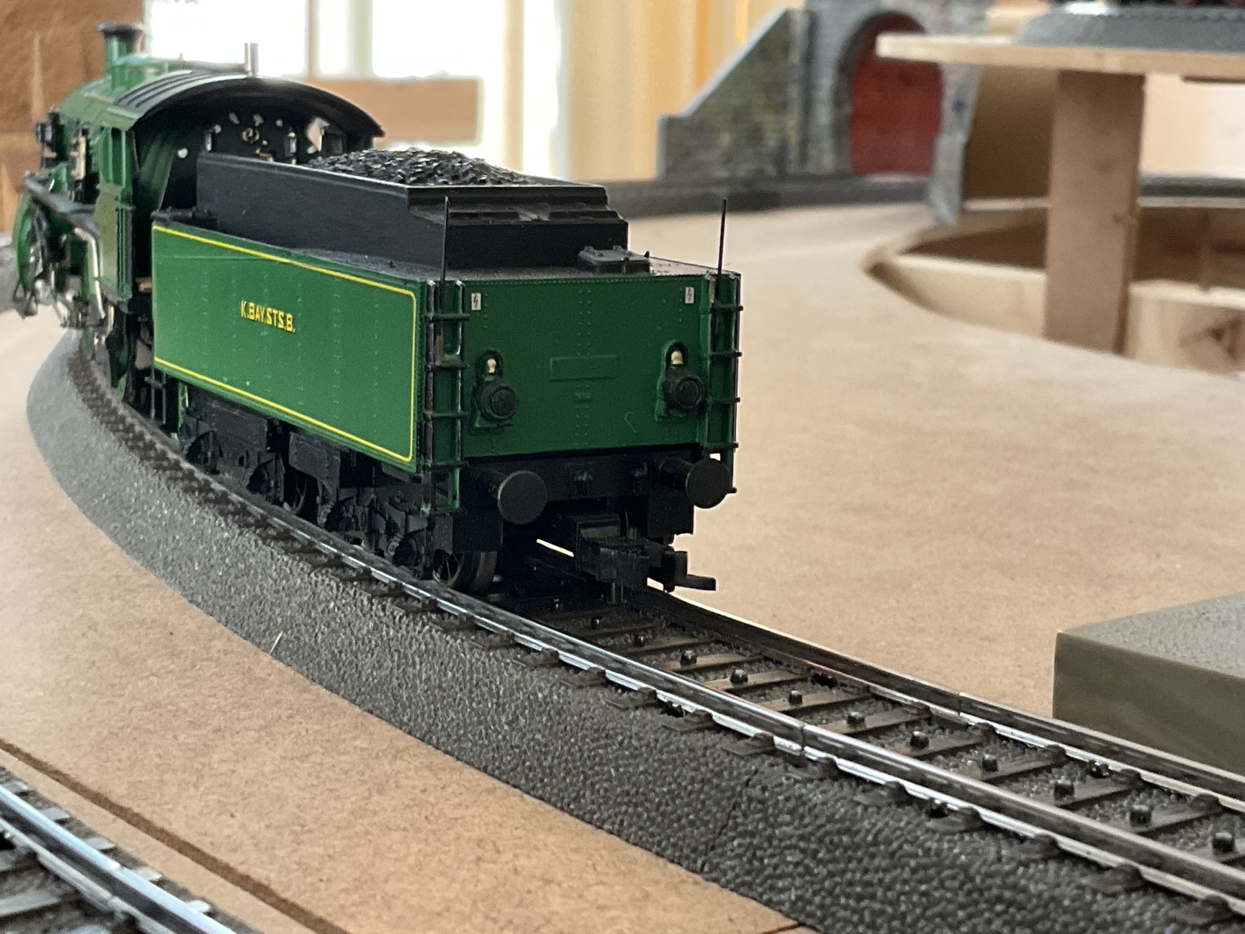 Tenderopbouw zwart geverfd. Stokersgereedschap geplaatst. Tevens rails op de tenderopbouw geplaatst