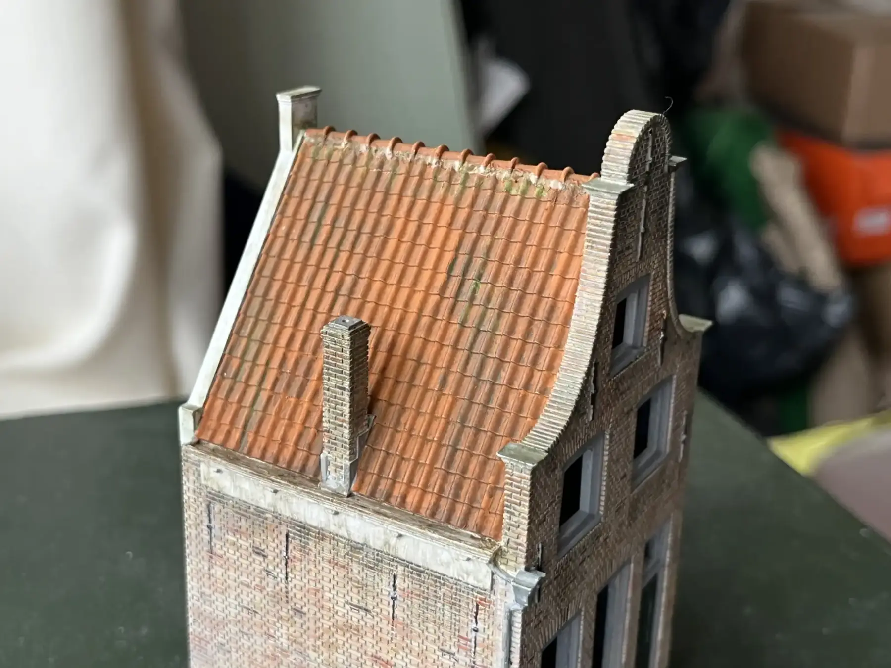 Het dak verweer ik met een grijs/zwarte wash en dan met felgroen (mos) en lichtgrijs (kalk) wat details aanzetten. Wel rekening houden met de wind en zon, want het dak is vaak aan twee kanten verschillend verweerd.