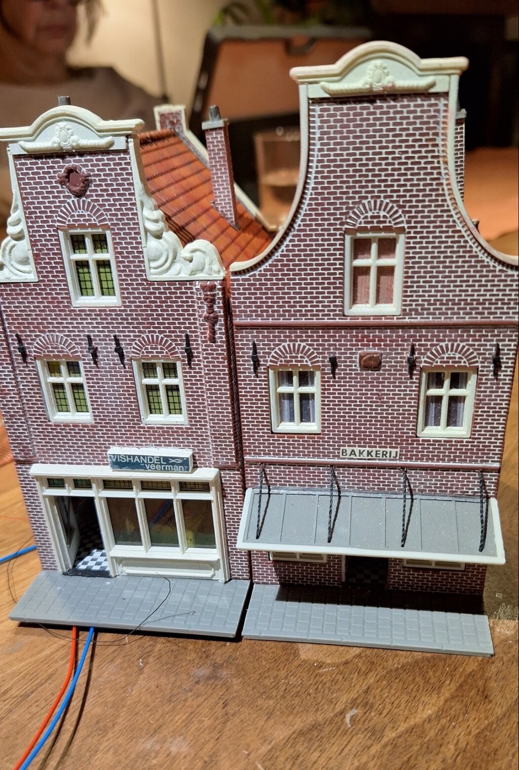 Dan ff de verlichting erin laten schijnen door het nog niet gemonteerde dak. Ziet er al gezellig uit. De bakkerij krijgt nog wat aankleding.