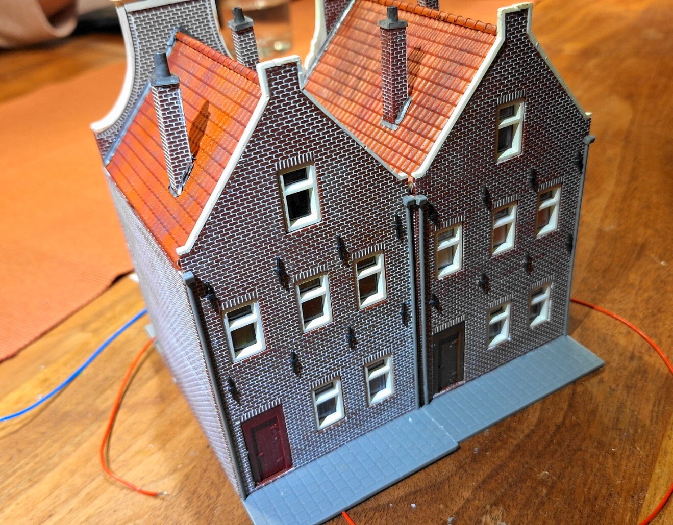 Ziet er zeker mooi uit! Ik zou alleen de ornamenten op de voorgevels nog wel een kleurtje geven. Rood ziet er m.i. een beetje apart uit. Dat scheepje op het rechter huisje kan best in een paar kleurtjes en het ornament boven het zolderraam van het linkerhuisje zou je bijv. grijs kunnen maken. Ook die horizontale richels op het rechterhuis zou ik een kleurtje geven. En als je het wit aan de bovenkant van de gevels met verdunde verf wat vervuild, komen die versieringen er ook veel mooier uit. Je kunt eventueel ook wat steentjes boven de ramen een kleurtje geven (wit of grijs.