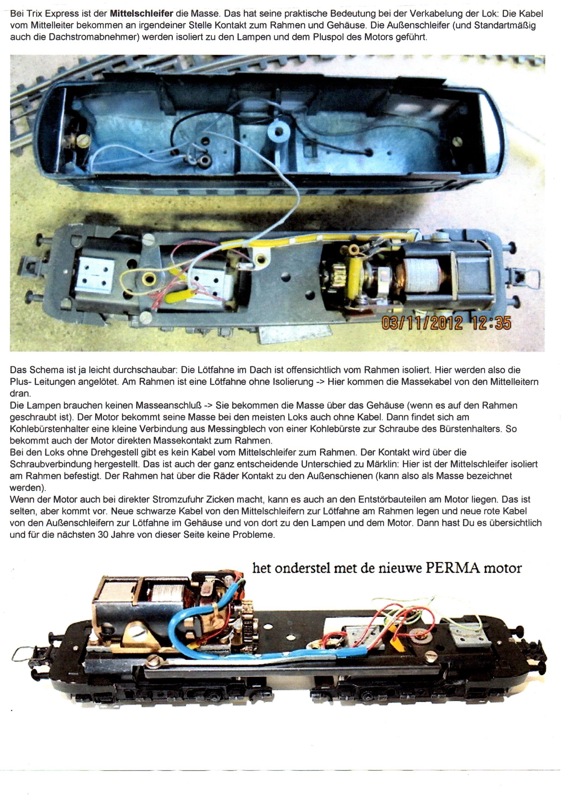 Hallo, je schrijft 2232. Dat is de oorspronkelijk Trix Express-versie van de BLS-loc. Dus voor het 3-rail DC-systeem. Die voor het genormaliseerde 2-railsysteem was de Trix International 2432. De stroomafname bij de TE is zodanig ingericht dat de middenrail, anders dan bij Märklin, de minpool is. De beide rails zijn geïsoleerd ten opzichte van elkaar, daarom kunnen dus twee locomotieven, eentje omdraaien, op één spoor rijden. Bij gebruik van bovenleiding drie. Hierbij een plaatje van de standaardinrichting van 2232.