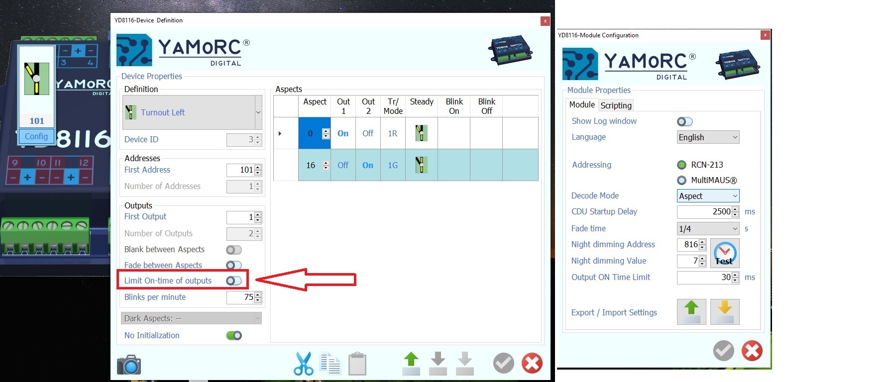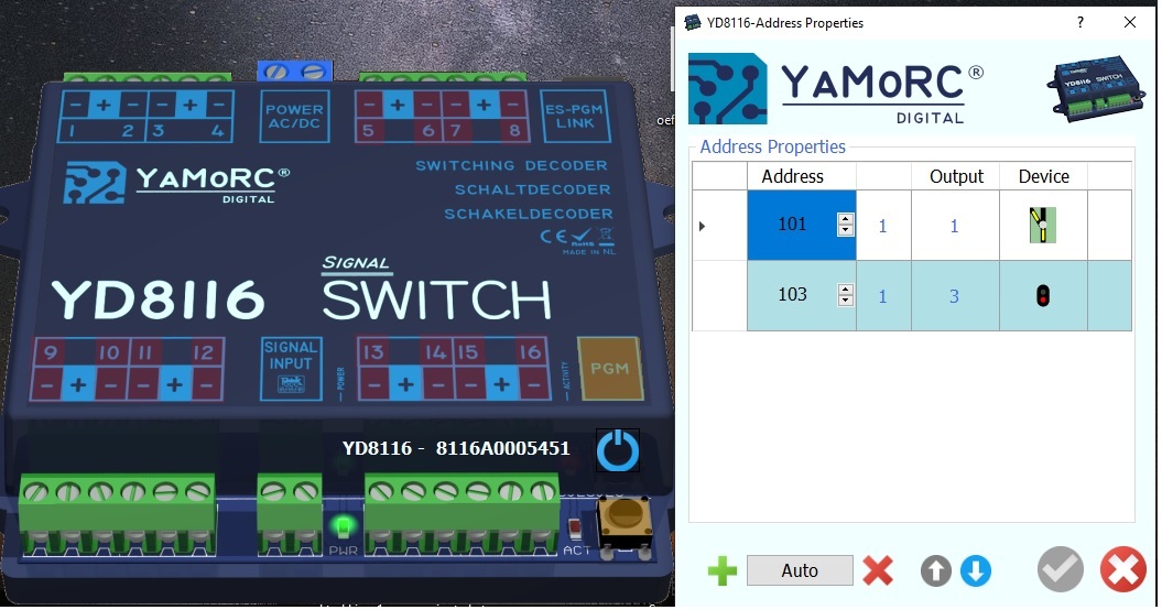 Vanuit rocrail kan ik dus de seinen ook prima aansturen (met de optie aspect in de decoder aangezet) De MP1 op een andere poort 1 & 2 met adres 101 van de decoder werkt helaas niet. Ook niet als ik kies voor trigger/mode of binairy reageert de MP1 nietHet 2 kleuring sein zit op poort 3 & 4 op adres 103 en werkt prima vanuit rocrail