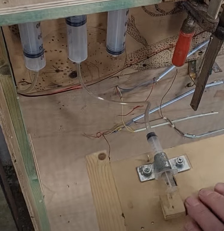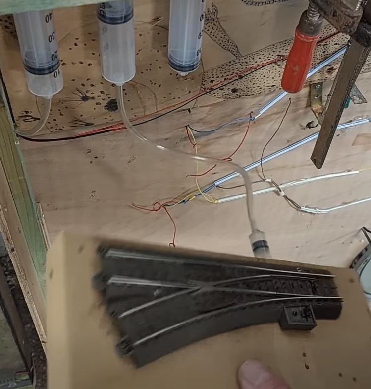 Ik zag op Facebook deze verrassend eenvoudige manier om wissels om te zetten met luchtdruk. Per wissel een grote en een kleine maat spuit, verbonden met een flexibele slang. Ik gebruik deze methode in het DAF museum om de werking van pneumatiek uit te leggen.