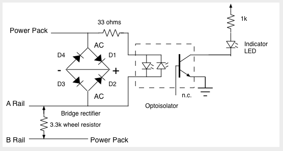 Dit is de bezetmelder die ik toepas, galvanische scheiding van het DCC signaal, op de uitgangen heb ik een groene en rode LED welke op het paneel komen. Twee LEDs, zonder trein in het baanvak groen en bezet is de rode LED aan, zo weet ik dat de bezetmelder actief is. Vervolgens een uitgang van dit module op een RS-8 aansluiten en via een RS2PC interface naar de Rasberry Pi. Van het plaatje komt de schakeling je waarschijnlijk wel bekent voor.