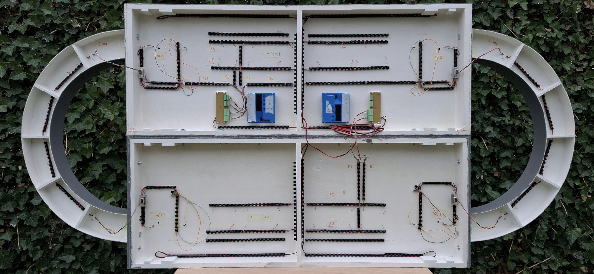 Hier ligt het spoor er nog meer verloren bij. Dit komt door de gekozen constructie en omdat het de bedoeling was om vier opstelsporen te maken maar door de wissels werd de lengte van de sporen wel erg kort. Dus genoeg ruimte om materieel neer te zetten en de Itrain laptop op te stellen. De bochten zijn zelfdragend maar ik wil ze voor de zekerheid nog wel afsteunen op de pootconstructie