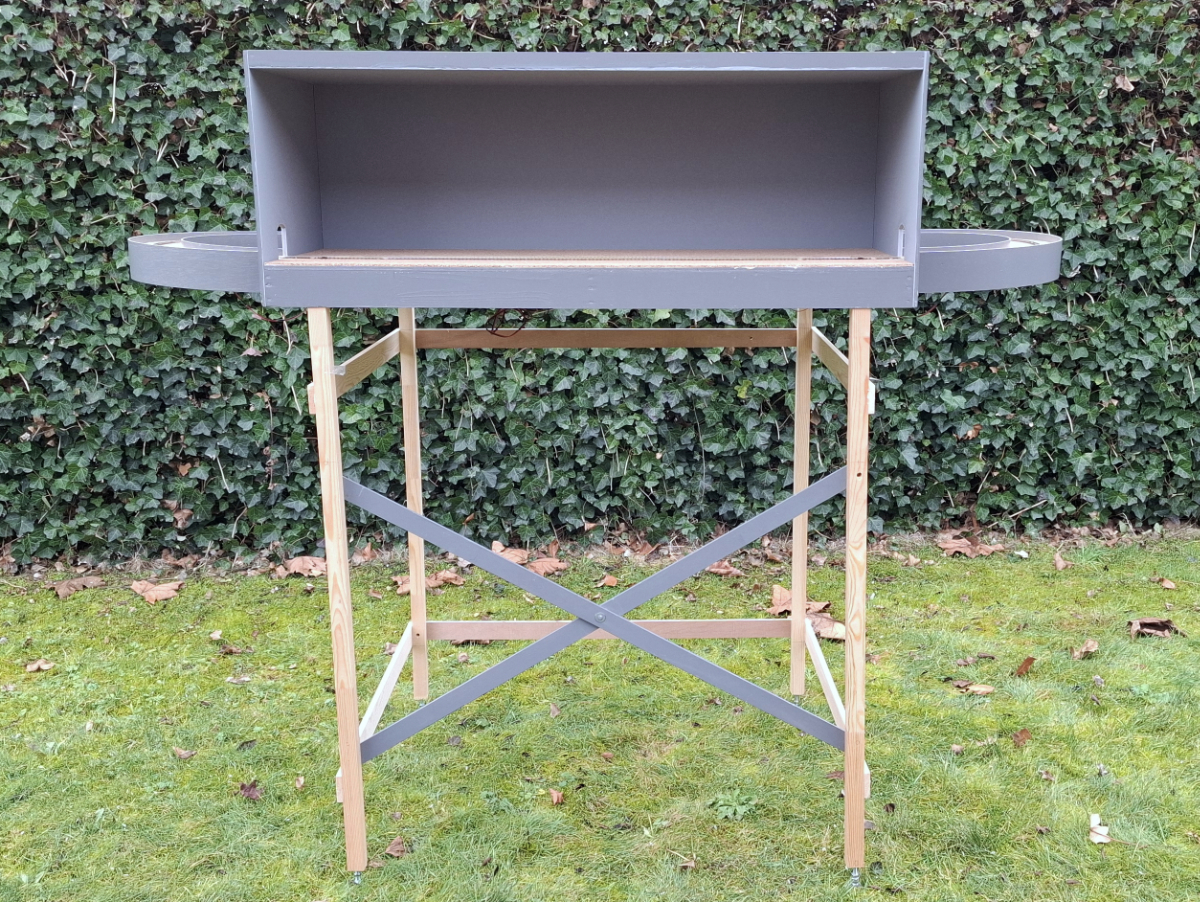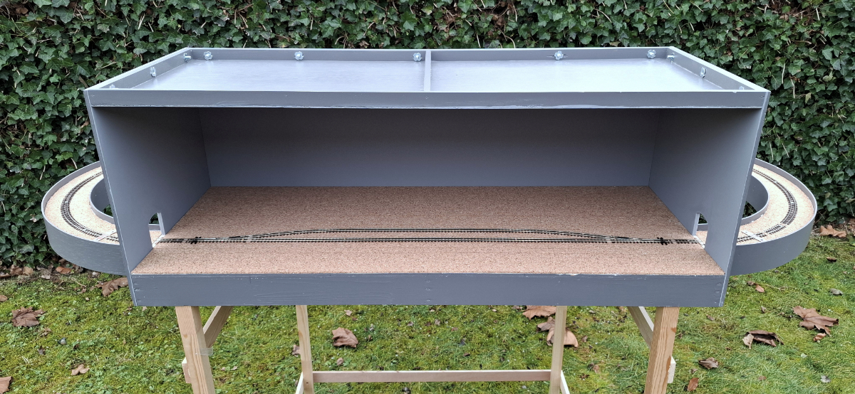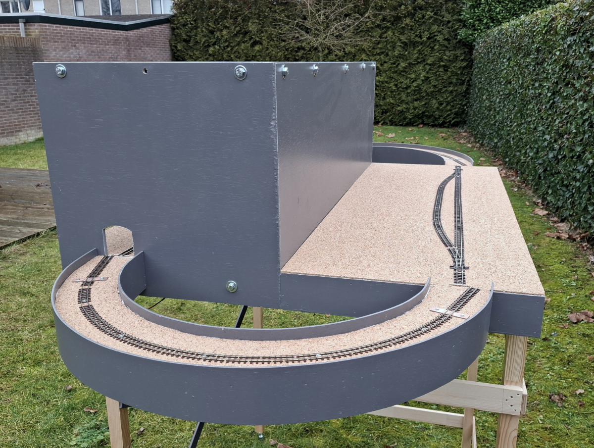 Het geheel is opgebouwd uit vier losse delen, scenic module, fiddleyard, twee bochten en staat op een pootconstructie om het geheel makkelijk op te stellen en uit te lijnen. Er komt nog een plaat op de onderste dwarsliggers van de poten te liggen voor droge opslag tijdens de beurs. De afwerking van de voorkant zoals frieslijst, afwerklijst, frontplaten etc.worden later nog aangebracht.