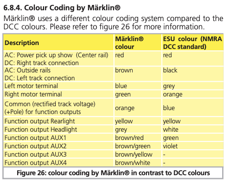 In de handleiding van de ESU decoder staat letterlijk een conversie-tabel voor de kleuren die Märklin gebruikt ipv de DCC NMRA standaard.