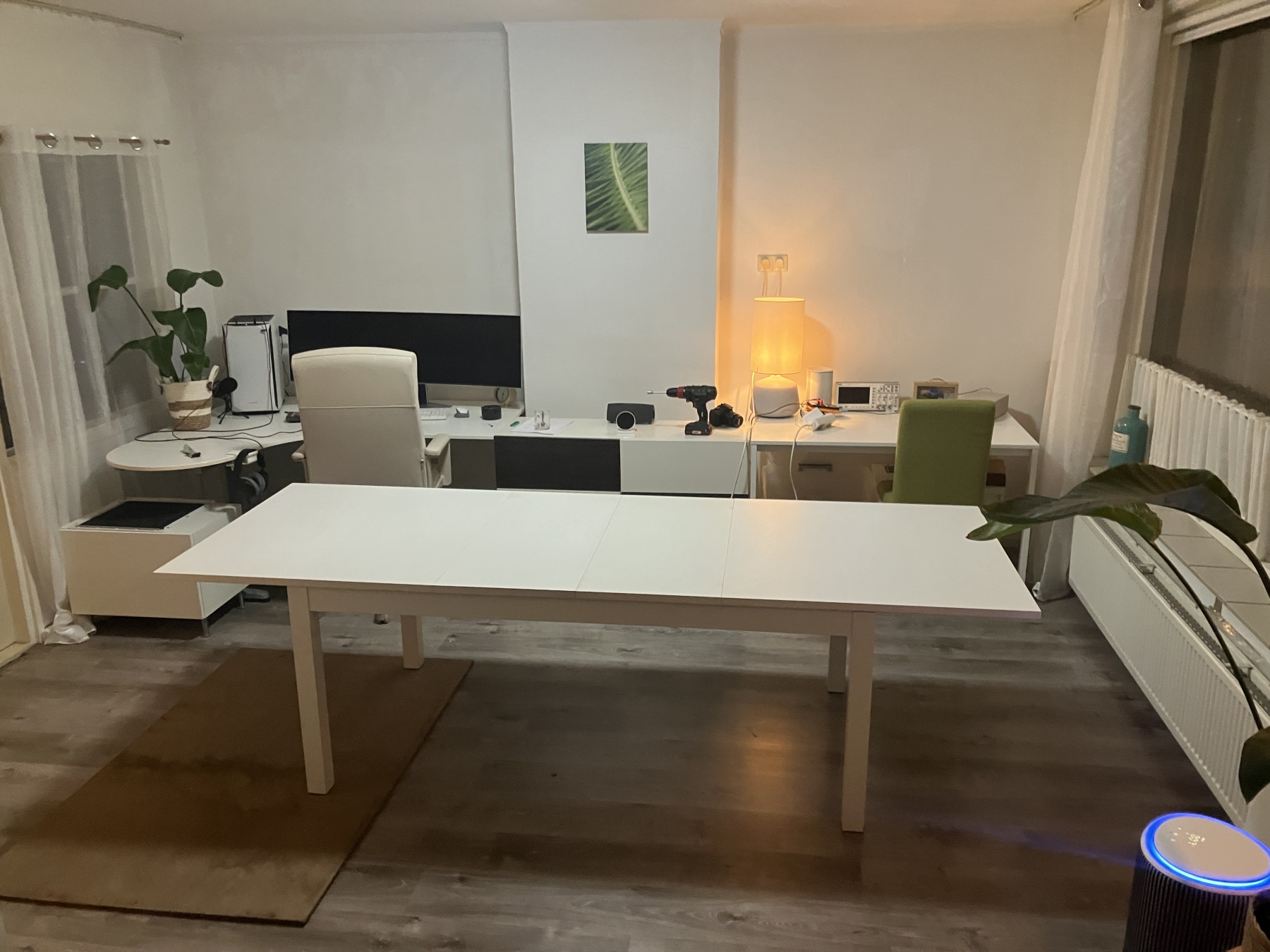 In eerste instantie zet ik tafels en een bureau in het midden waar ik de underlaymentplaten op leg, dat geeft mij een werkblad van 375x260 cm.