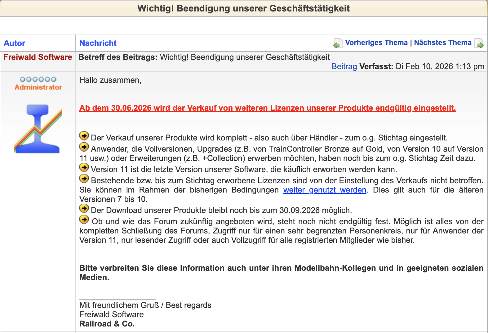 Zoals op bijgaande afbeelding te zien lijkt het erop dat Herr Freiwald met de ontwikkeling van Train Controller gaat stoppen.