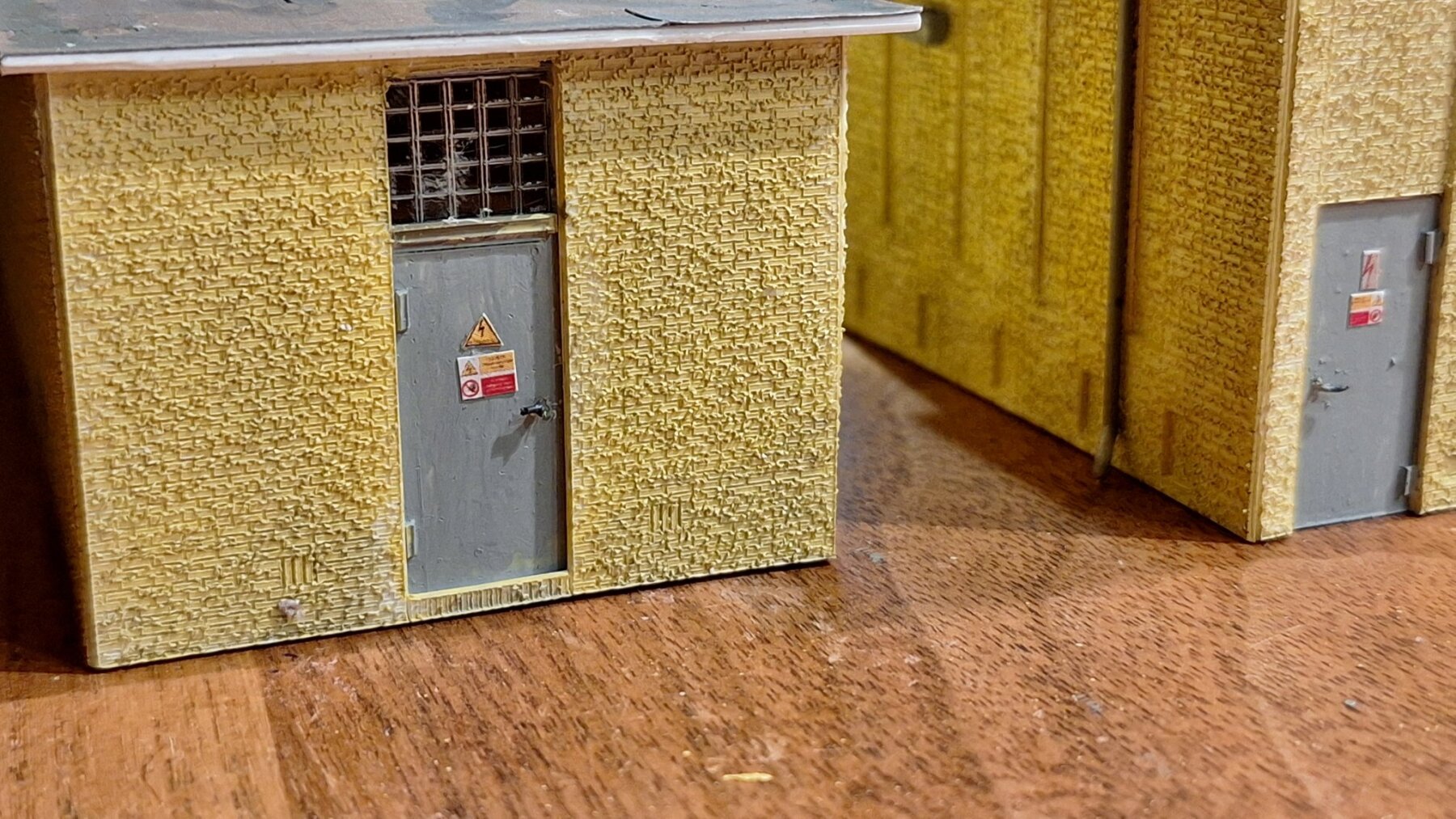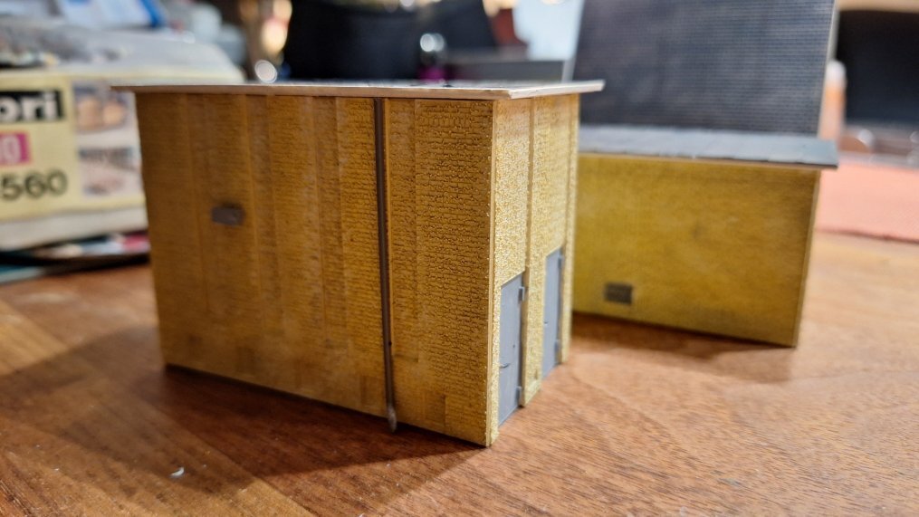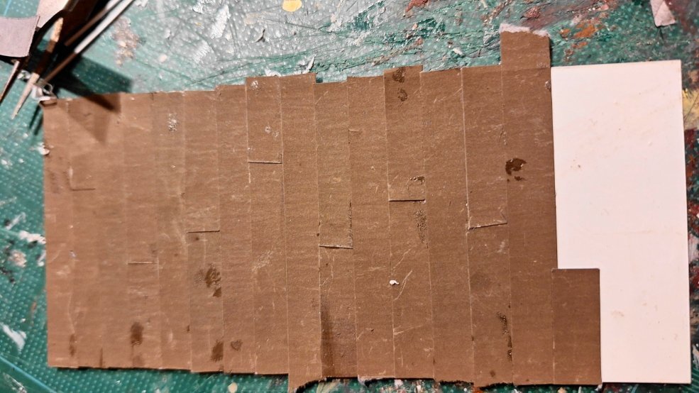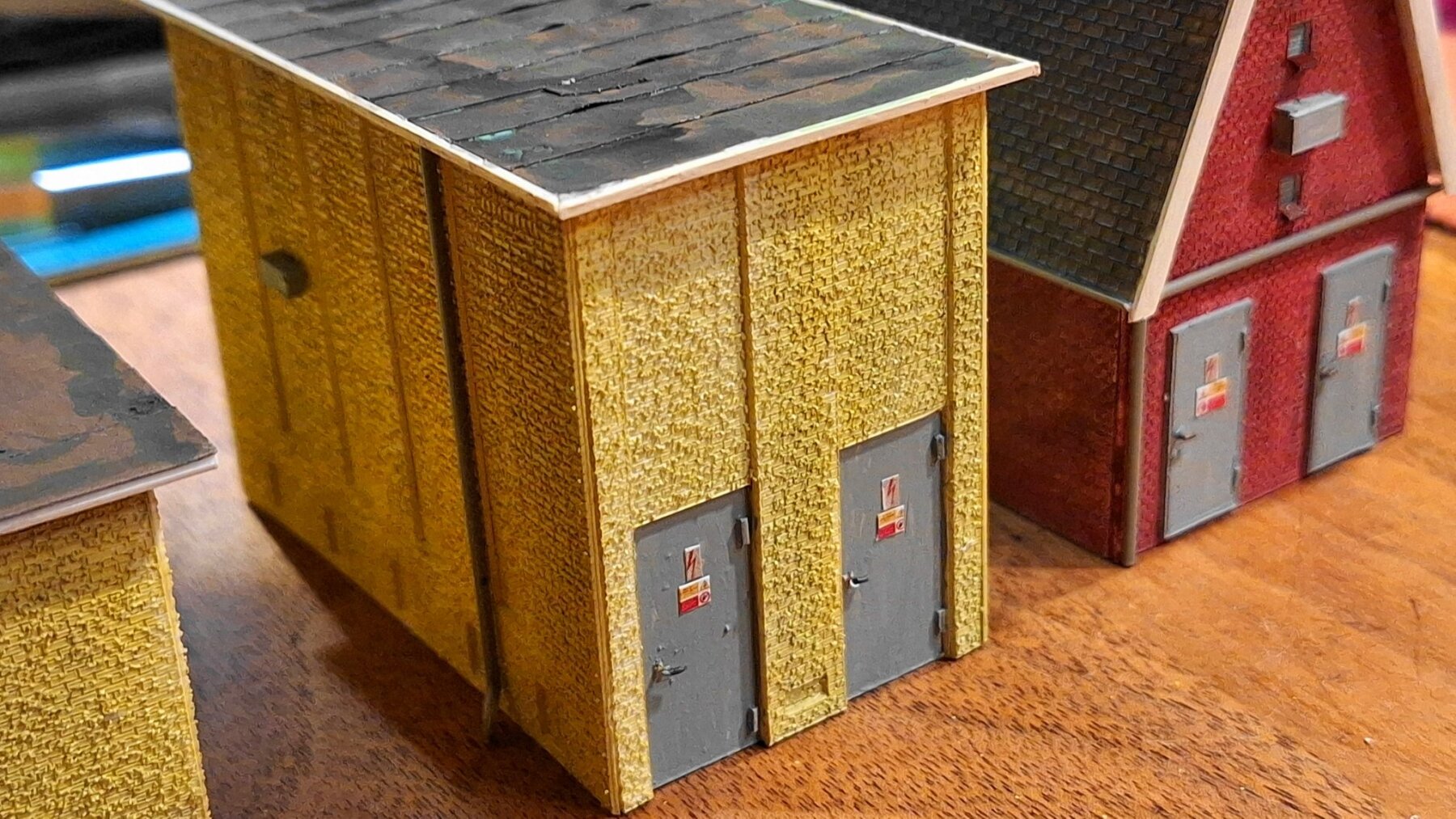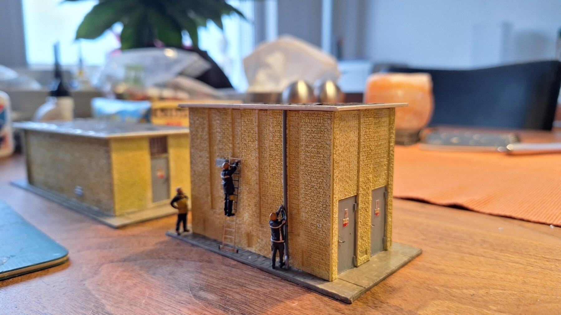 Dan de daken van het tweede plotje, het schakelstation met relaihuis, voorzien van stroken fijn schuurpapier, net overlappend verlijmd.