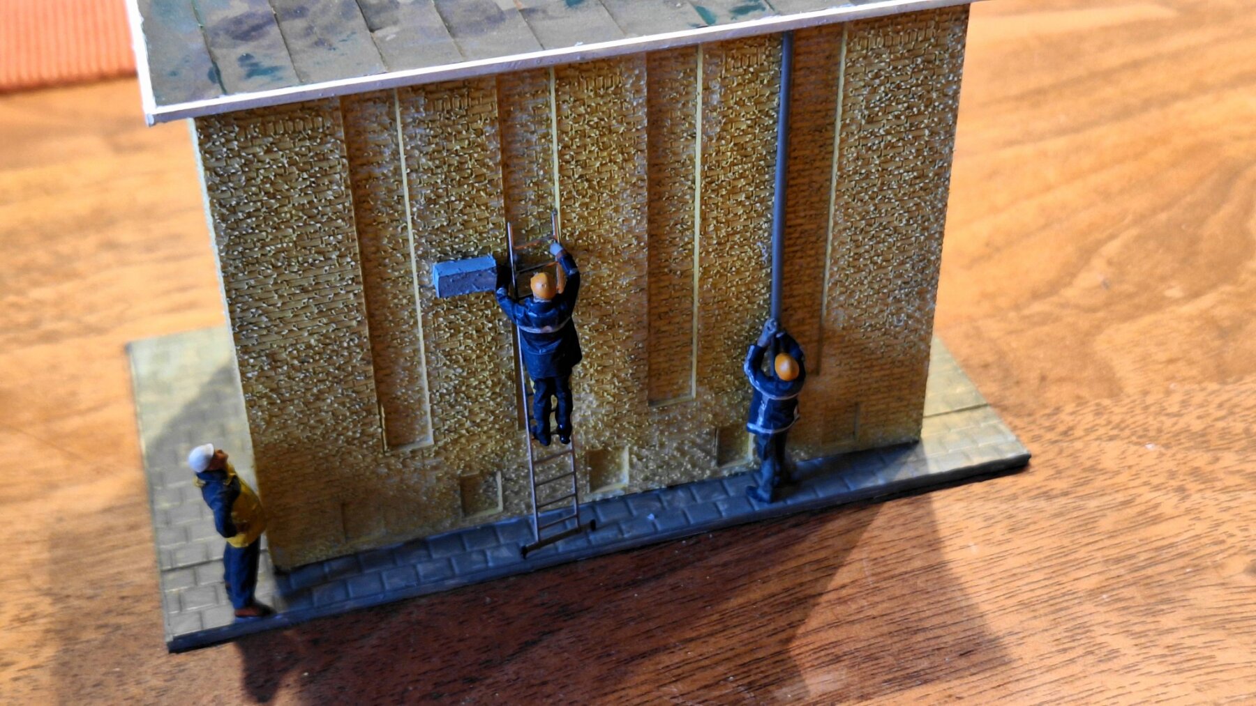 De regenpijpen waren over van de HollandScale stadhuizen. De deurstickers zijn van het internet geplukt, in Word verkleind en uitgeprint.