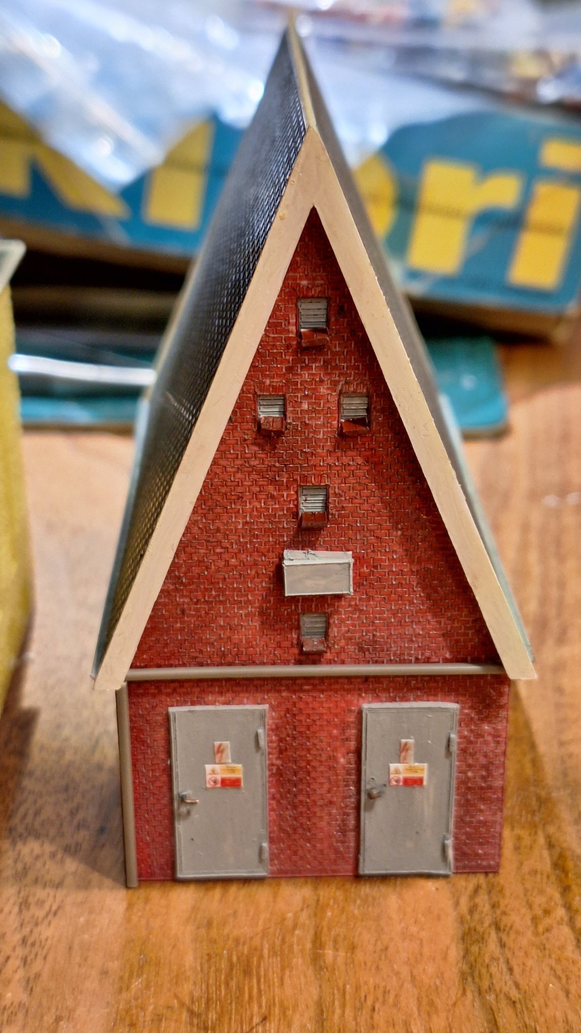Het dak erop en de deuren geverfd en van deurklinken voorzien, gebogen van een stukje koperdraad. De dakgoten zijn van halfrond Evergreen.