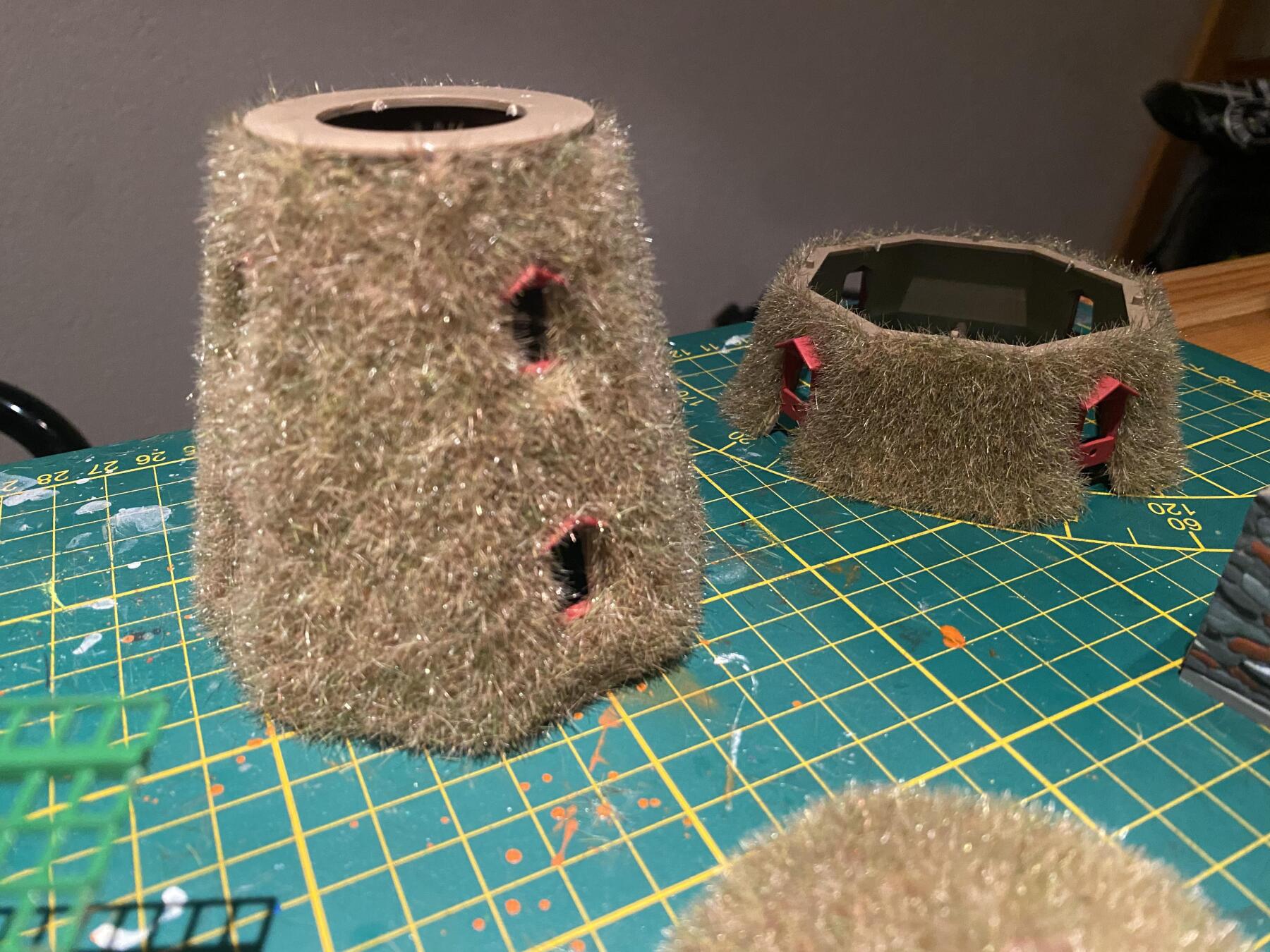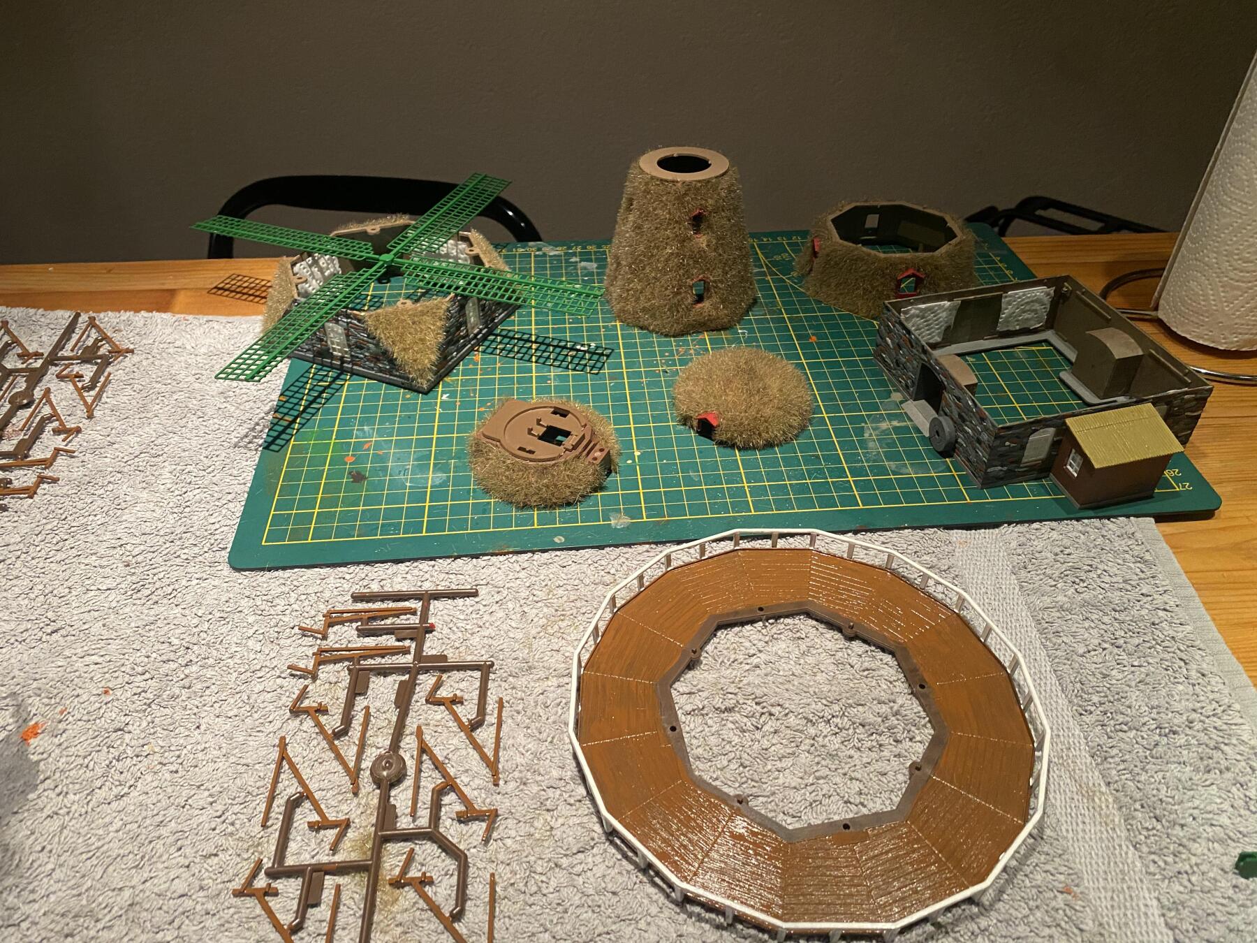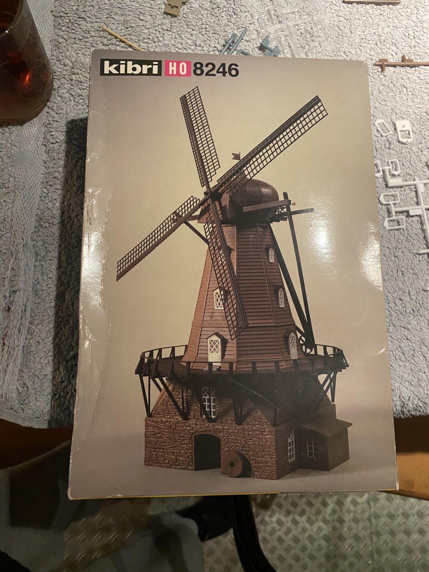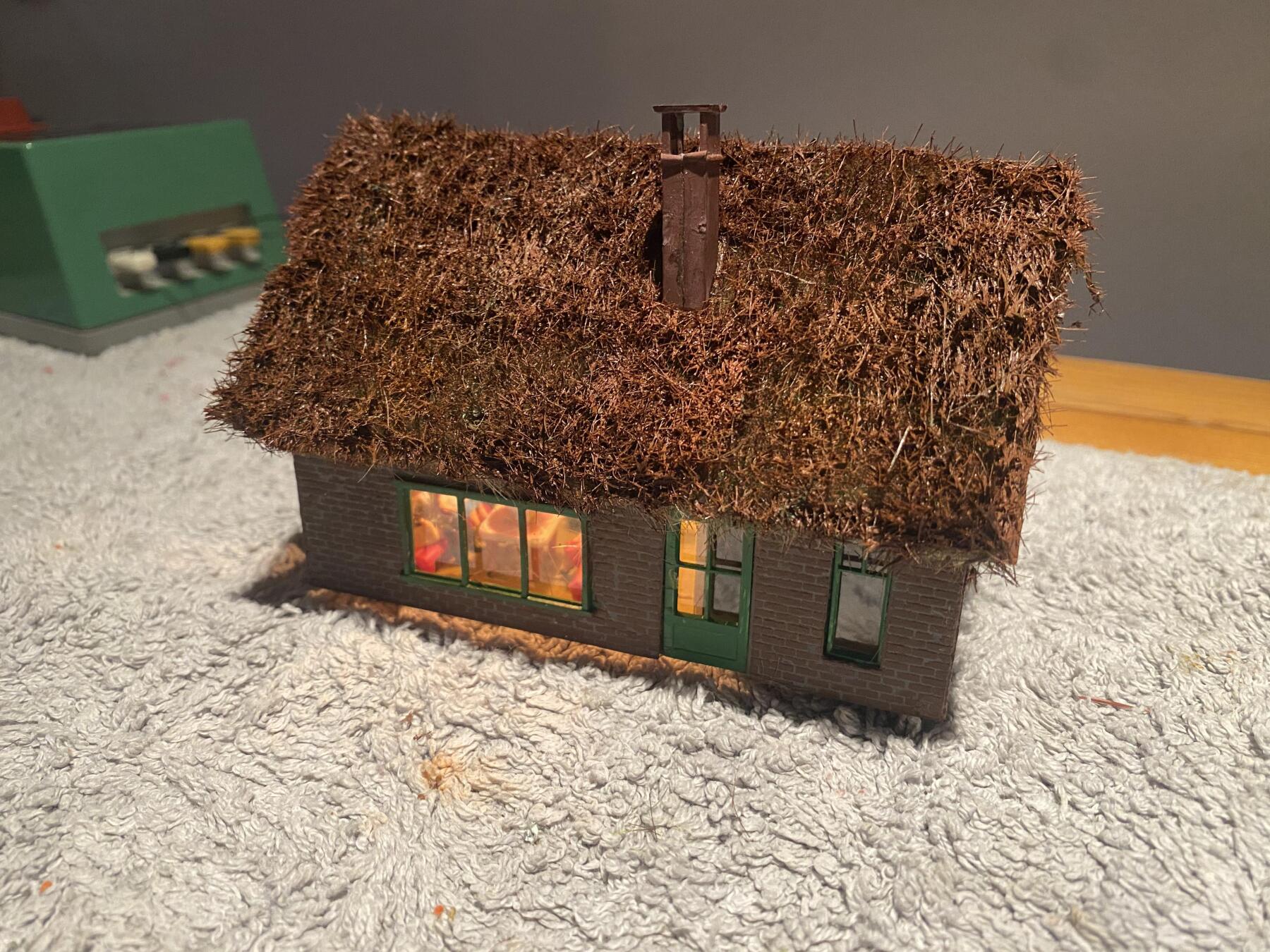 Het station ligt te drogen, ondertussen verder gegaan met de Kibri molen, ik tracht er enigszins een Nederlands model van te maken. Vandaag eea in de verf gezet en de diverse onderdelen van de molen met de grasmaster te grazen genomen, morgen verven. Ik heb vorige week een klein huisje van een rieten dak voorzien en dat resultaat viel me niet tegen. Dit bracht me op het idee om het op de molen toe te passen. Ben benieuwd of het eindresultaat een aanwinst zal zijn op mijn baan. B.t.w. Ik vind het grappig wat aan te klooien of het nu esthetisch is of niet kan me eigenlijk niet zo boeien.