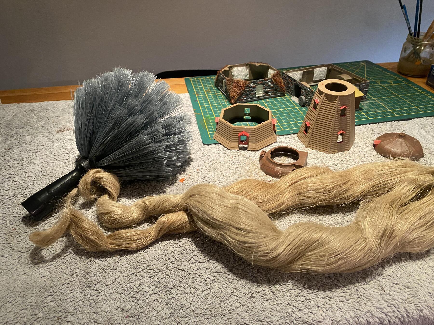 Mocht ik vandaag nog wat tijd ergens vandaan halen dan wil ik nog iets anders proberen om een rieten dak na te bootsen, hiervoor moet ik wel een aantal afwasborstels aanschaffen en verknippen. Zal wel een plens met werk zijn maar als het wordt zoals ik het voor me zie dan lijkt me dit ook wel een mogelijkheid.