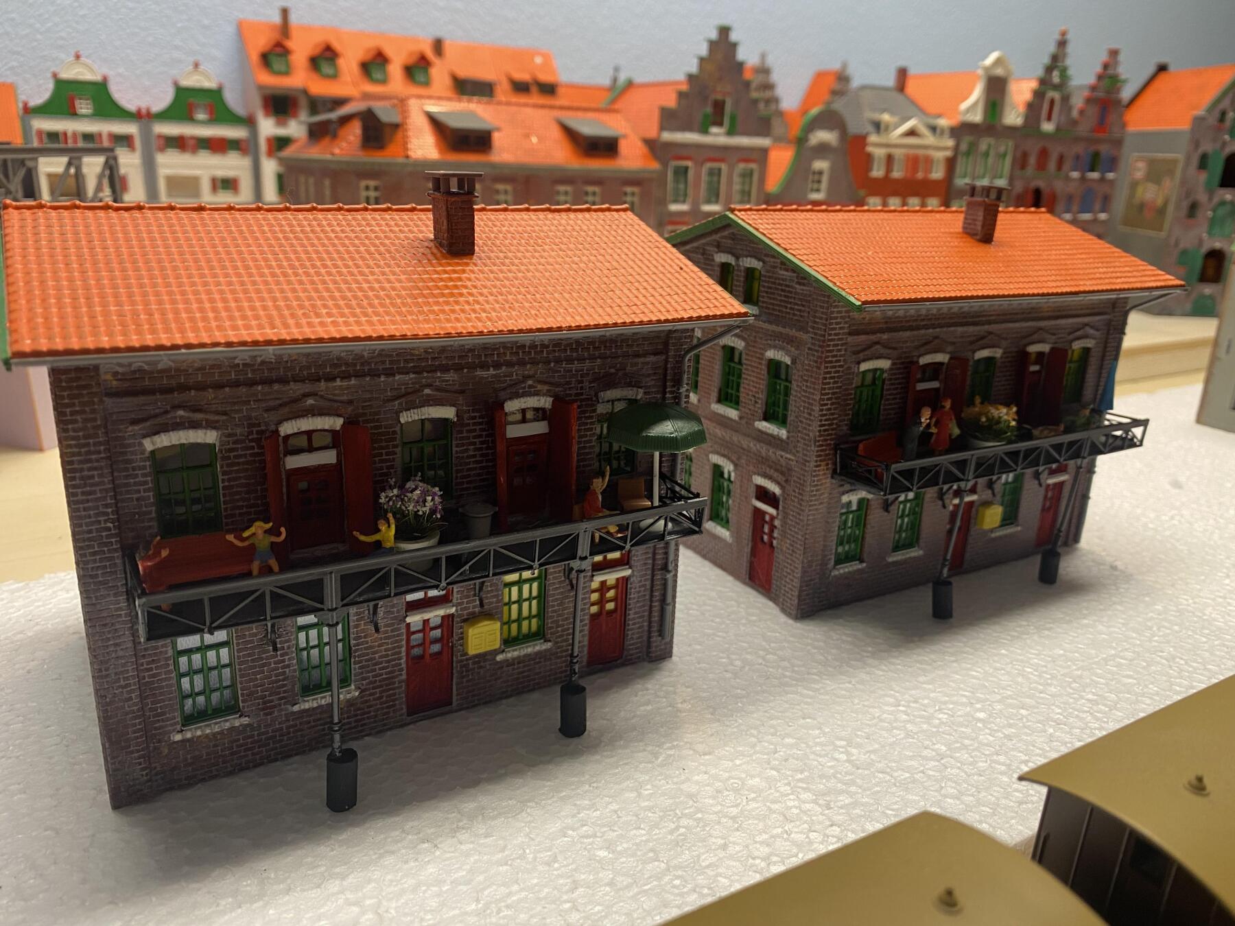 Nu beide bovenstaande bouwsels liggen te drogen begin ik met het verbouwen van 2 Pola 1000/station Waldbrunn-kitts. En, al zeg ik het zelf, het is een leuke manier om vrij eenvoudig een 4-appartementen-complex te maken. De setjes doen via MP 10 euro p/s. Dus voor 40 euro heb ik een 4-tal prima Nederlands aandoende gebouwen. 2 had ik er reeds in een eerder stadium gebouwd en voor de foto even op de plek gezet waar straks het station moet komen te staan.