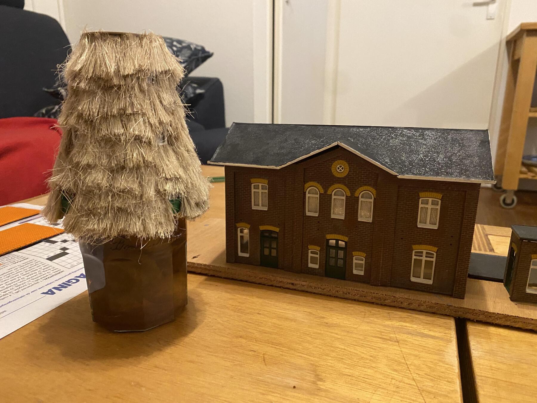 Het station ligt te drogen, ondertussen verder gegaan met de Kibri molen, ik tracht er enigszins een Nederlands model van te maken. Vandaag eea in de verf gezet en de diverse onderdelen van de molen met de grasmaster te grazen genomen, morgen verven. Ik heb vorige week een klein huisje van een rieten dak voorzien en dat resultaat viel me niet tegen. Dit bracht me op het idee om het op de molen toe te passen. Ben benieuwd of het eindresultaat een aanwinst zal zijn op mijn baan. B.t.w. Ik vind het grappig wat aan te klooien of het nu esthetisch is of niet kan me eigenlijk niet zo boeien.
