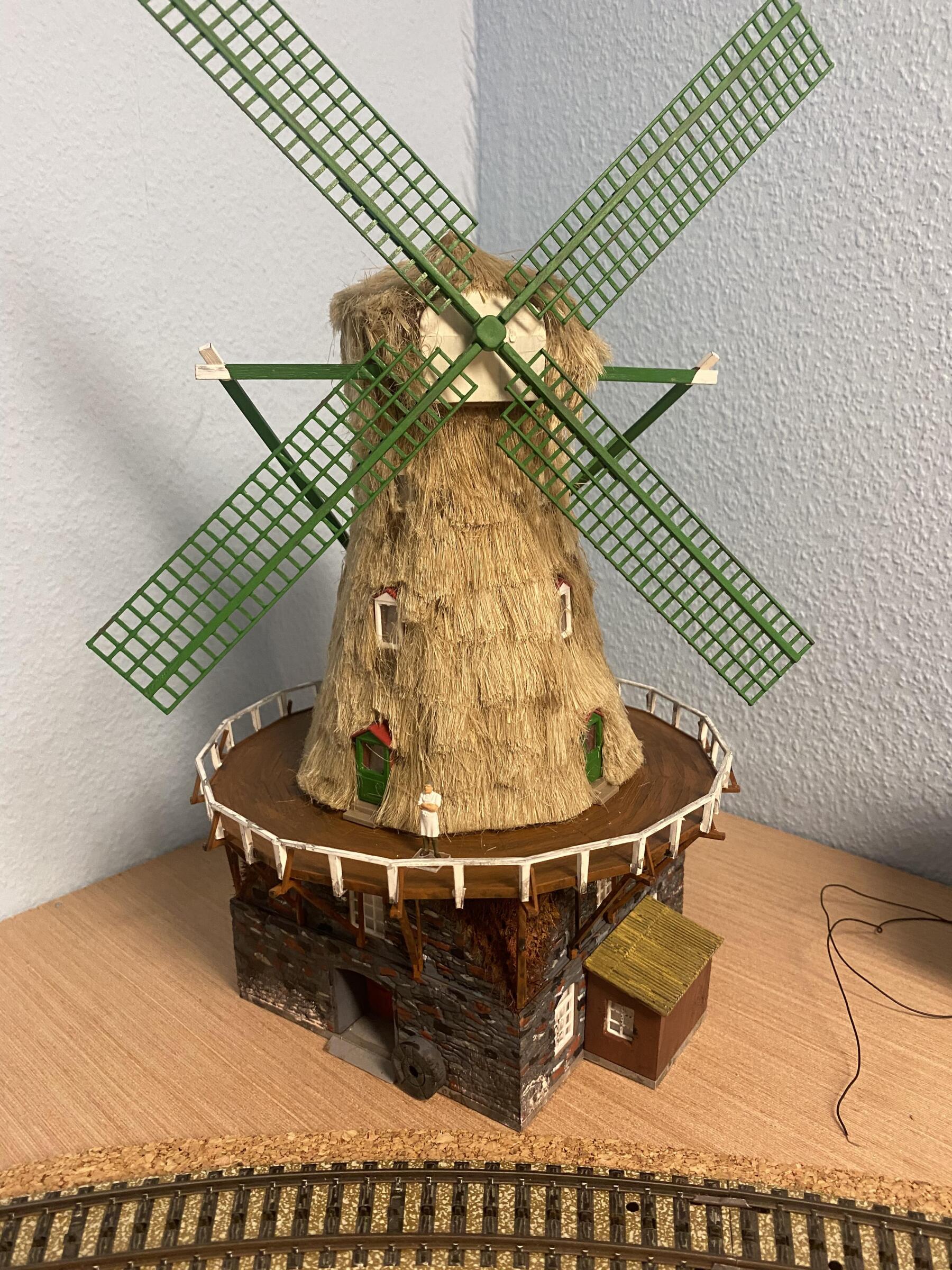 Het station ligt te drogen, ondertussen verder gegaan met de Kibri molen, ik tracht er enigszins een Nederlands model van te maken. Vandaag eea in de verf gezet en de diverse onderdelen van de molen met de grasmaster te grazen genomen, morgen verven. Ik heb vorige week een klein huisje van een rieten dak voorzien en dat resultaat viel me niet tegen. Dit bracht me op het idee om het op de molen toe te passen. Ben benieuwd of het eindresultaat een aanwinst zal zijn op mijn baan. B.t.w. Ik vind het grappig wat aan te klooien of het nu esthetisch is of niet kan me eigenlijk niet zo boeien.