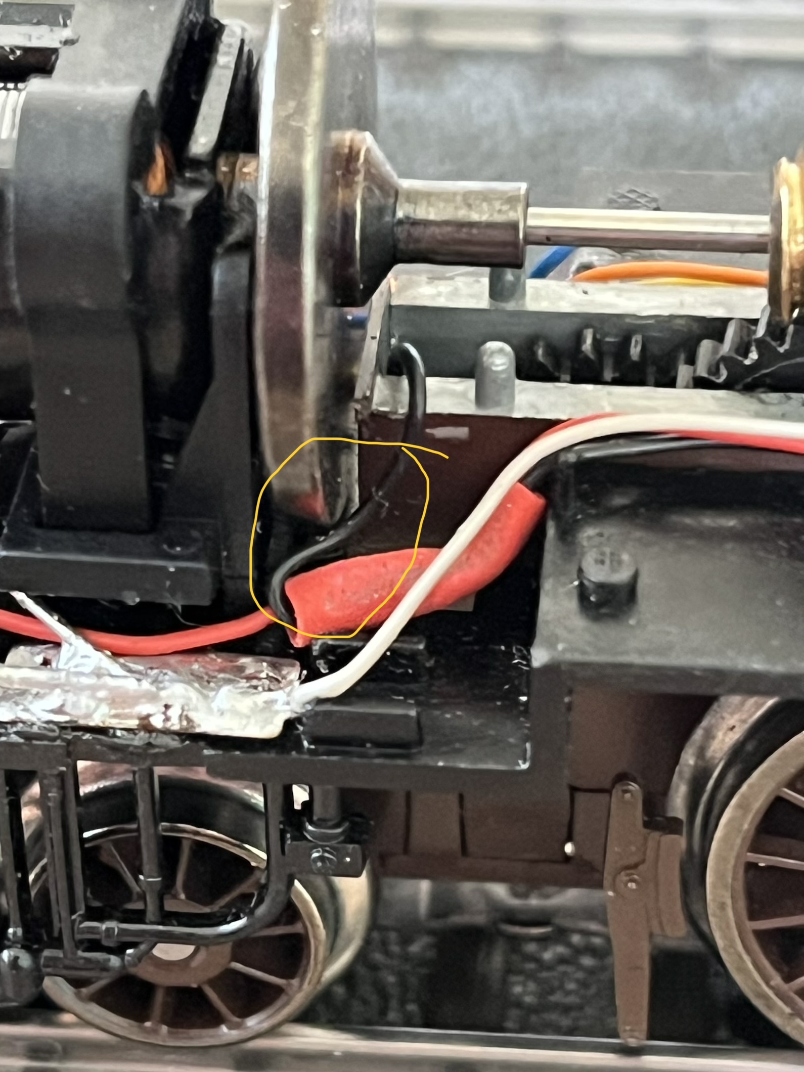 Getracht met een micro schroevendraaier het kabeltje zodanig weg te duwen zodat deze het vliegwiel niet meer kan raden. En raad eens? Loc rijdt voorwaarts! Geen sluiting.