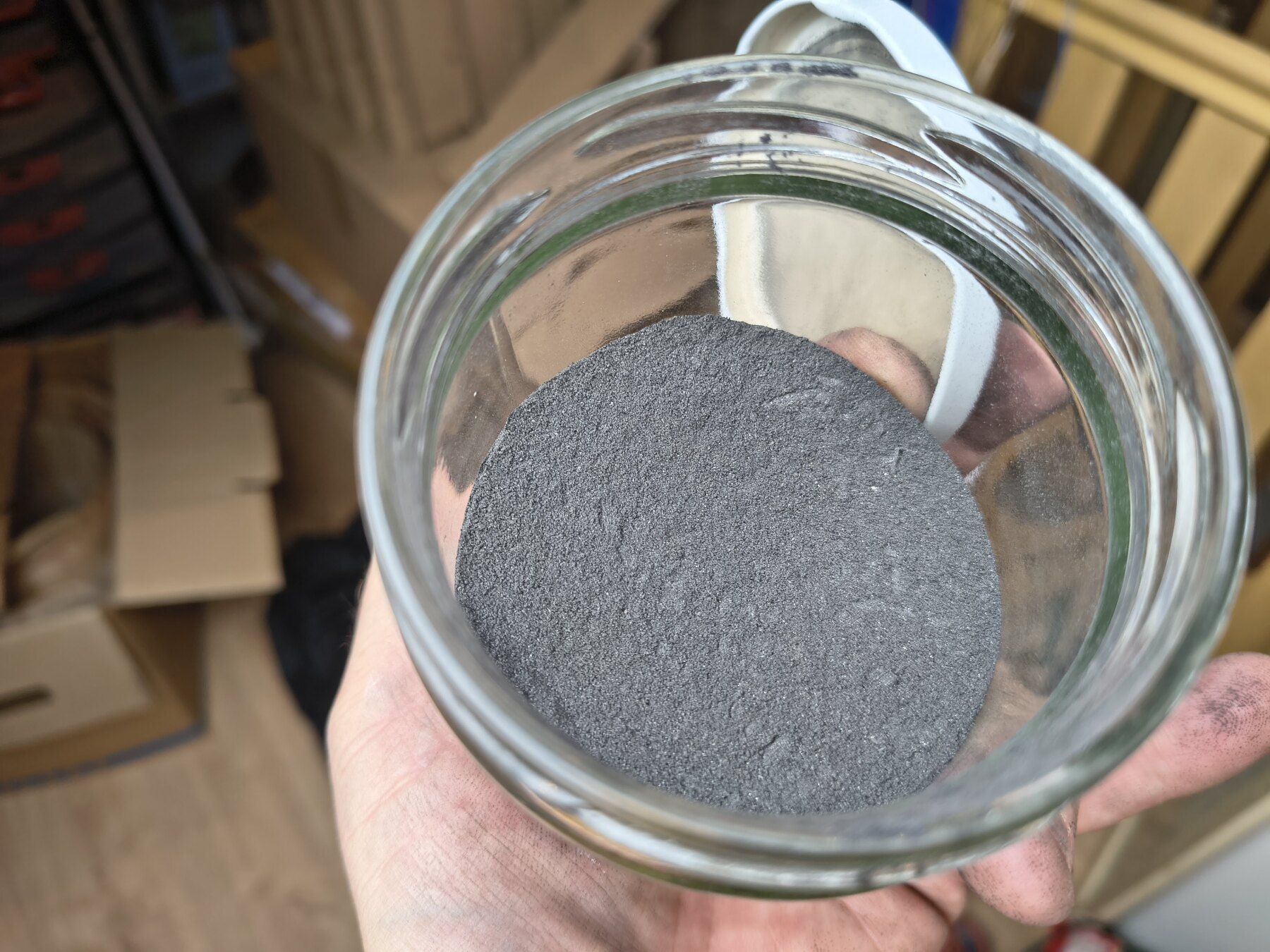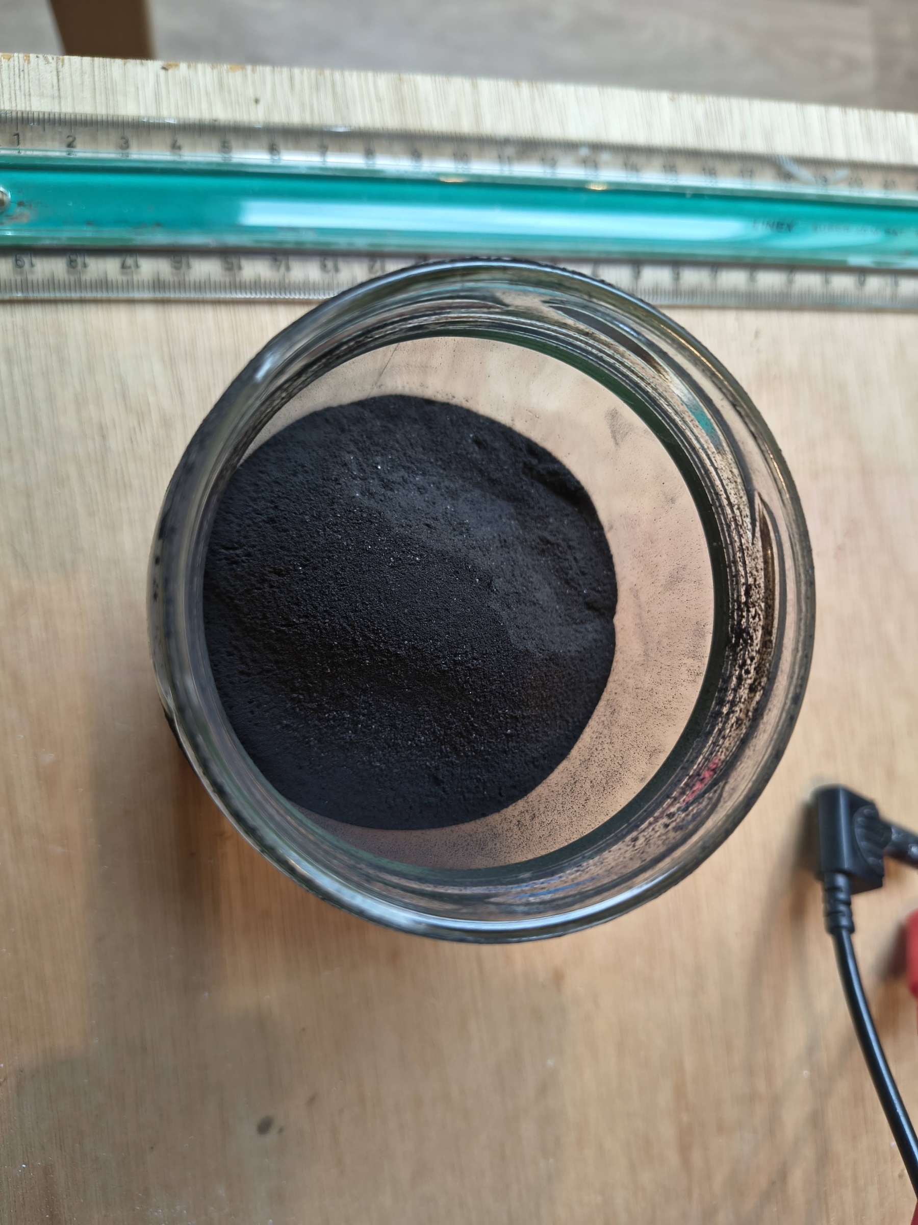 Ik wil een variant laten zien van de as-gips-lijm methode. Jaren geleden, bij het schoonmaken van de barbecue waarin ik geperste houtskoolbriketten had gebruikt, kwam ik briketten tegen die niet geheel waren opgebrand. Het buitenste deel was witte as, de kern bestond echter uit niet verbrandde zwarte briket die bij het oppakken bijna geheel tot fijn zwart stof verpulverde.