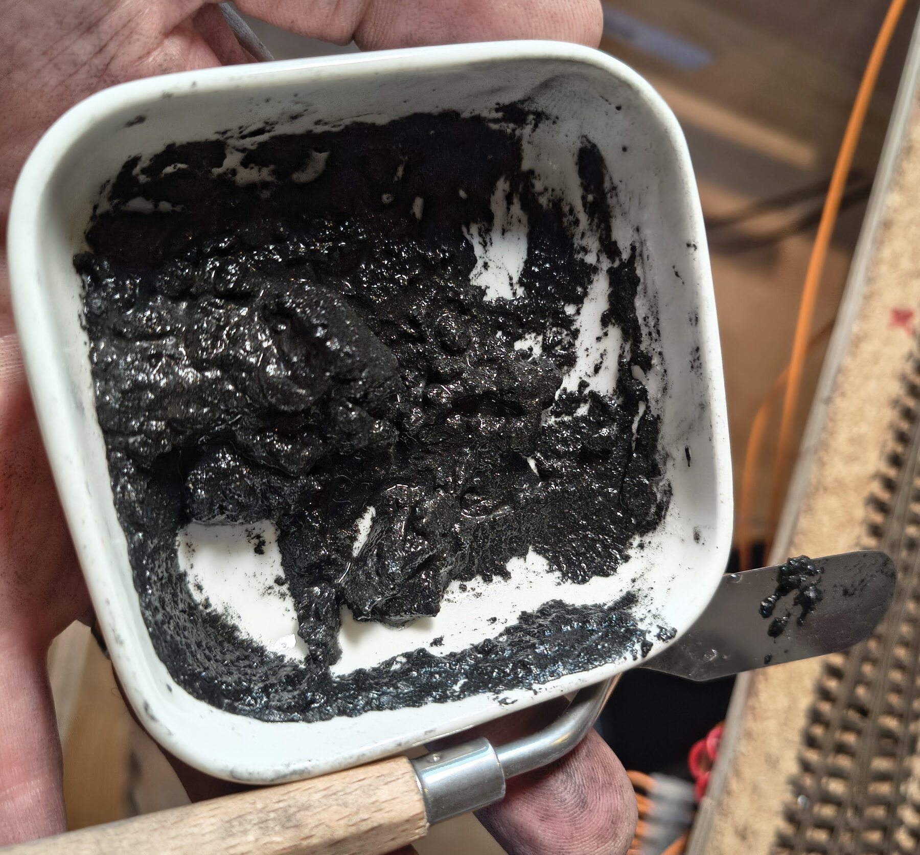 Afgelopen week heb ik delen van mijn perron geasfalteerd met een mengsel van houtskoolbriketpoeder, gips en behanglijm.