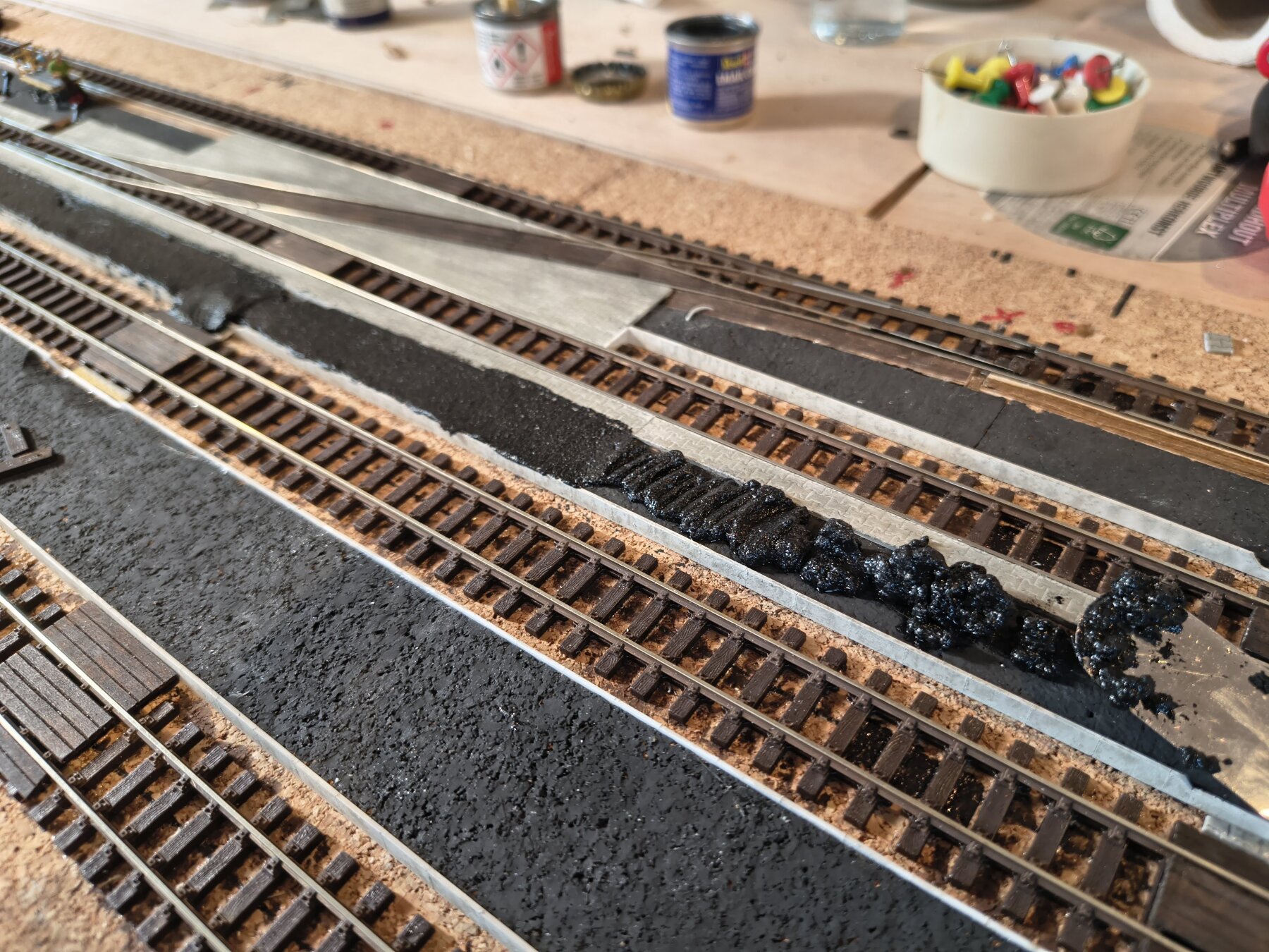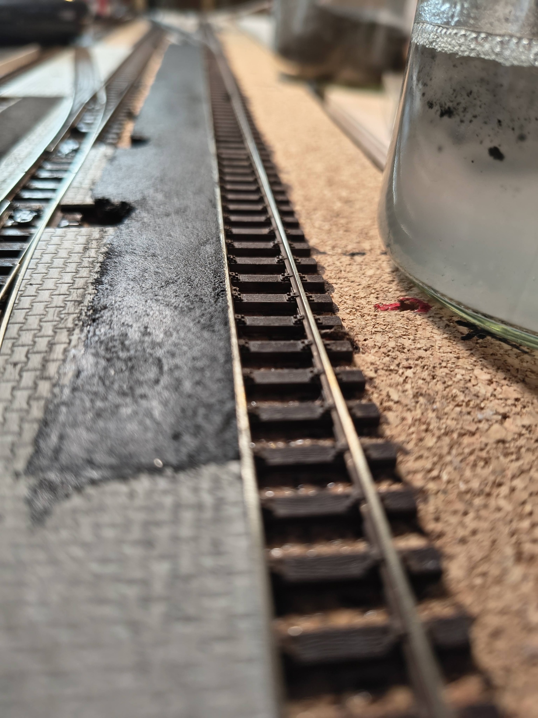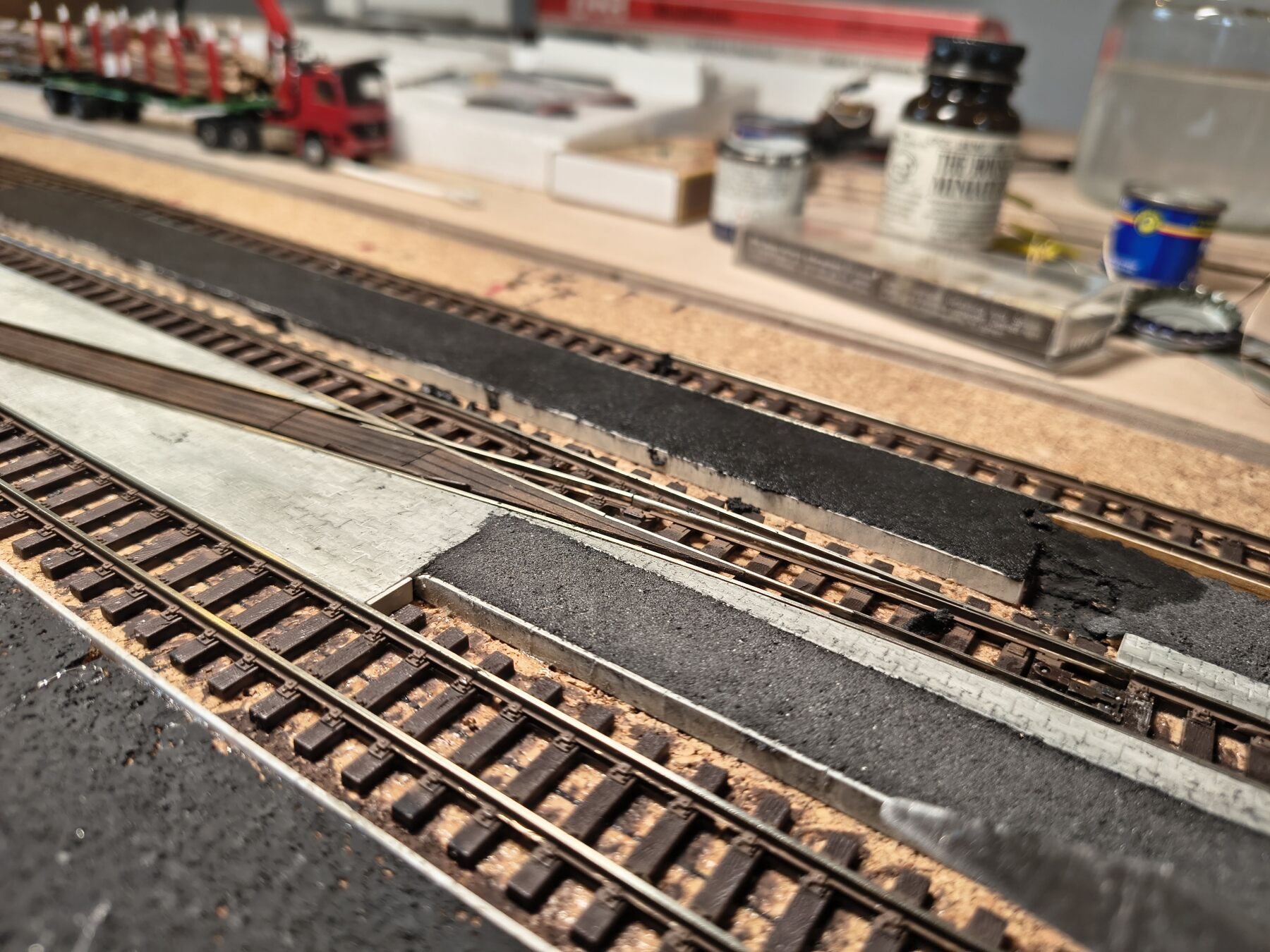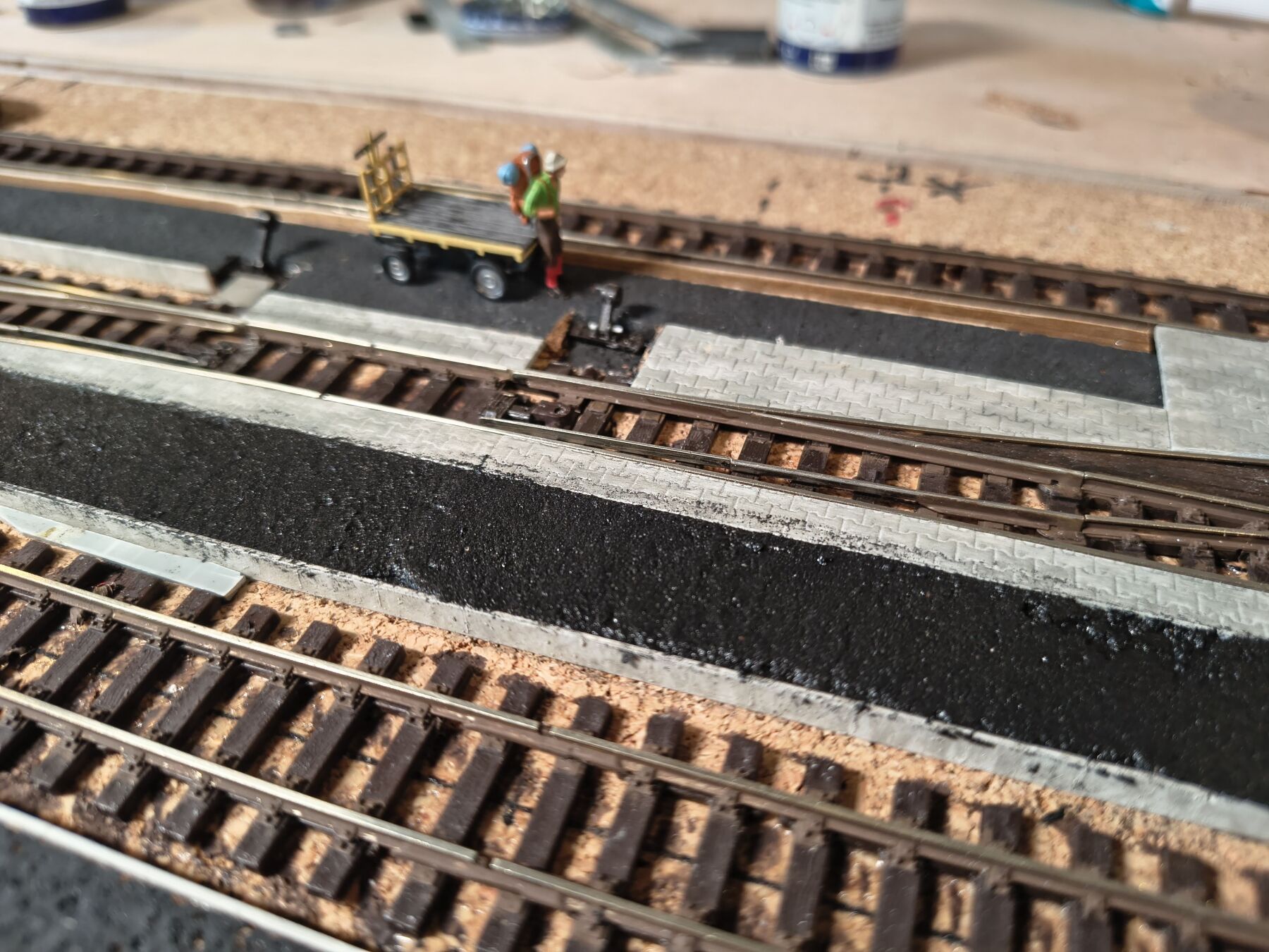De ondergrond van het peroon bestaat uit kurk en is met zwarte plakaatverf zwart geschilderd (perron op de voorgrond).
