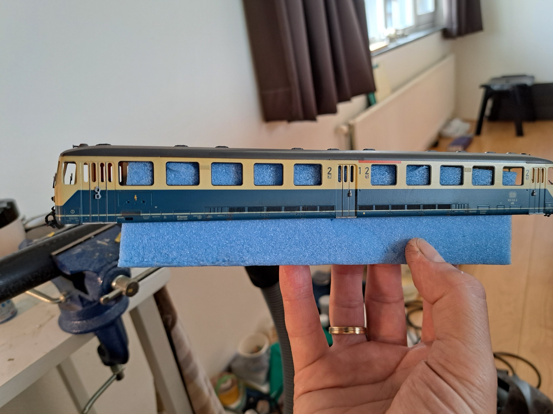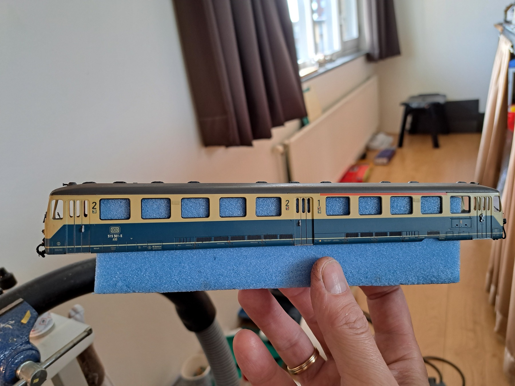 Het zijn de oceaanblauw beige varianten met stelnummers 515 501 , 515 512 en stuurwagen 815 685.