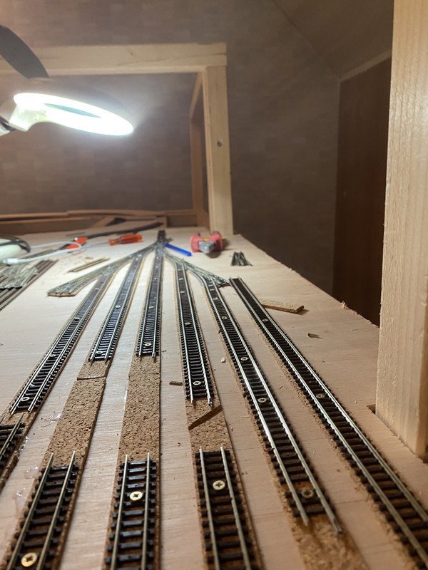 Nou we zijn van start  _o_  _o_  _o_  voor de verandering eens alleen kurk waar de rails ligt. Rechter spoor wordt later aangesloten op de wissel is nu mijn vertrekpunt van buiten naar binnen  ;)