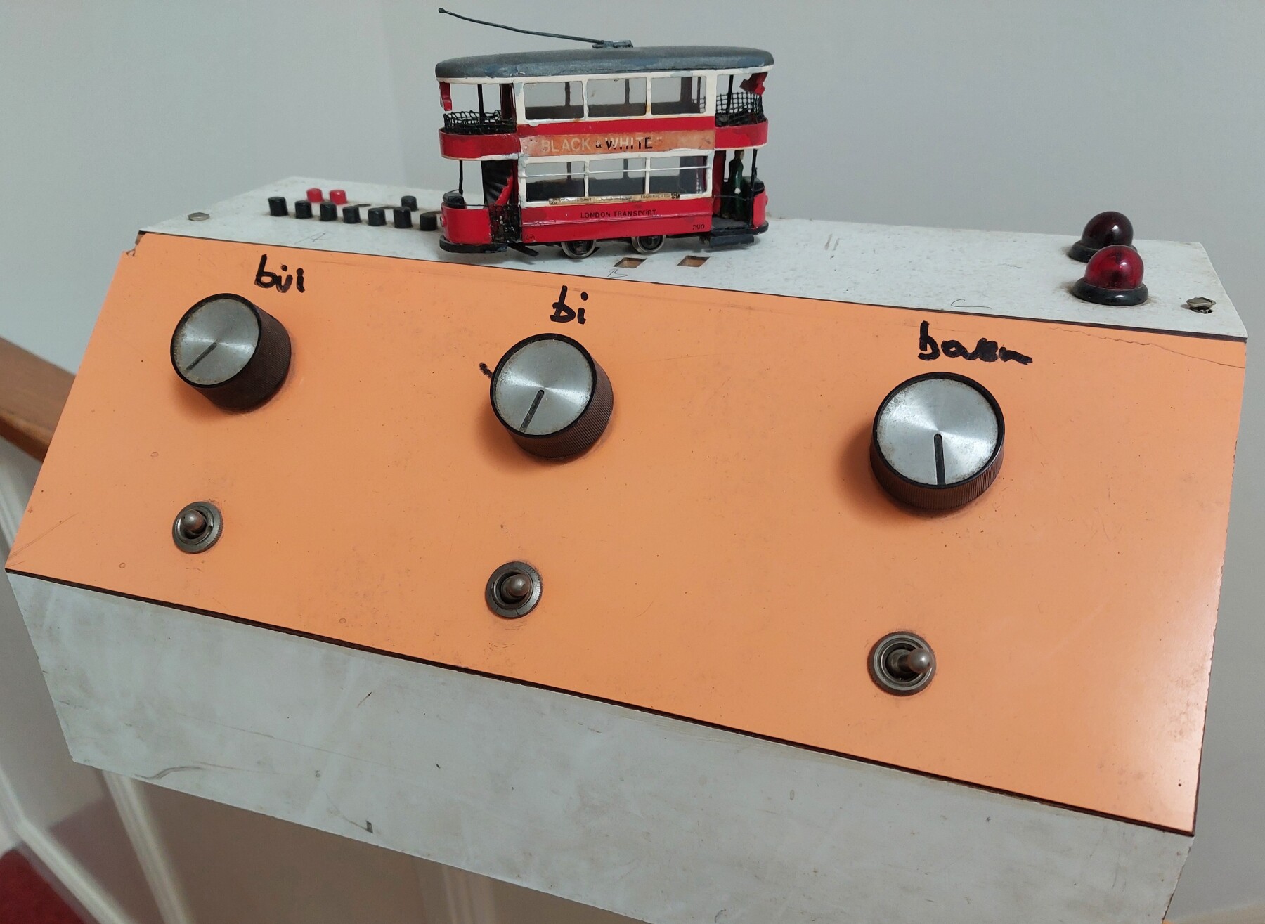 Op de laatste foto de kast die mijn vader bouwde waarin twee trafo's en drie regelaars voor de drie banen: de twee 'ovalen' en de rangeerbaan.