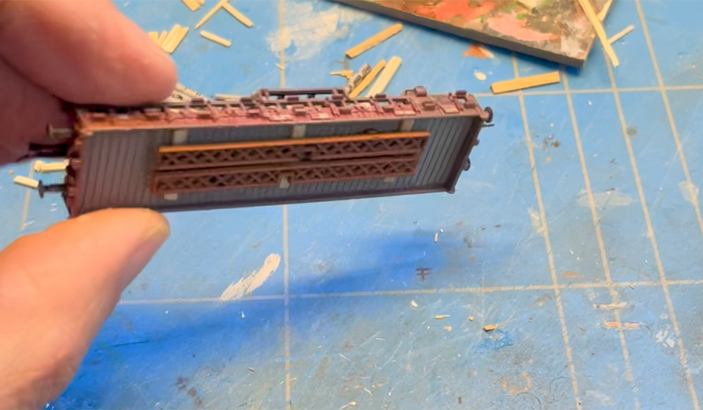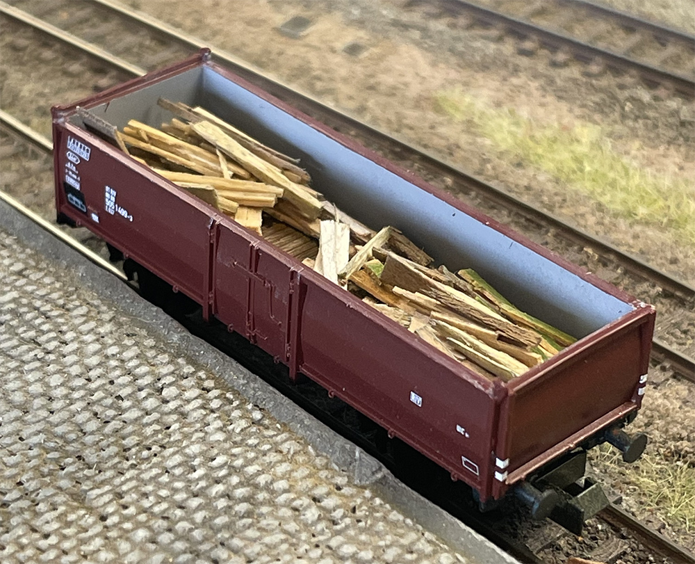 Een andere manier die ik nog niet heb gezien is om een extra bodem met plankenmotief te maken en daar de lading op vast te lijmen. Dan kun je de lading met de " vloer " van de wagen in zijn geheel uitnemen. Er zijn styreenplaten te koop met plankenmotief en anders een stuk styreen op maat snijden en daar zelf strookjes op lijmen in dezelfde maat als de " planken " op de bodem van de wagen. Deze kun je in de lengterichting even opruwen met schuurpapier en eventueel met een hobbymesje nog wat beschadigingen in de planken of langs de randen hiervan maken.