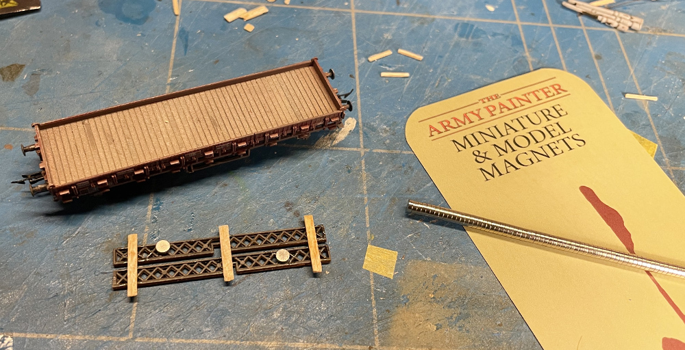 Inderdaad, met magneetjes kan dat prima. Hier voorbeeldjes hoe ik het gedaan heb, maar dit is N-spoor. De meeste spoor-N wagons hebben een metalen plaatje in de bodem verwerkt ter verzwaring. Magneetjes verwerkt in de lading houden de boel dan tijdens het rijden op z'n plaats.