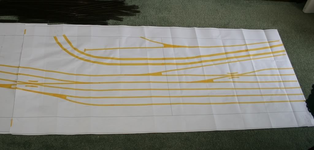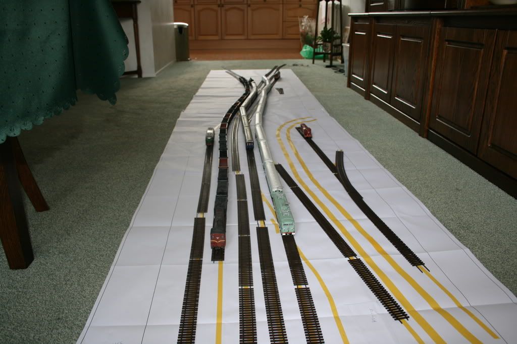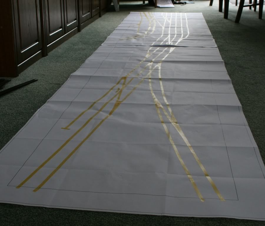 Nog een methode die ik heb toegepast voor het concept uitwerken van 4 toekomstige modules. Op grote vellen papier je baan in delen in 1:1 uittekenen (de buitenranden). Vervolgens met een paar wissels (van het type die je meer wil gaan gebruiken) gaan puzzelen en zo je sporenplan uitzetten met smal schilderstape. Je kan er dan ook meteen wat treinen/gebouwen bij zetten indien je al wat hebt en zo krijg je een goed beeld van hoe het kan. enigste probleem is hoe aan groot papier te komen, ik heb het via mn werk kunnen regelen, maar dat zal vast ook wel ergens anders kunnen.