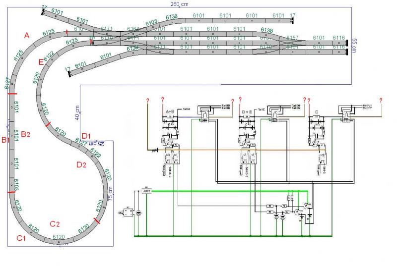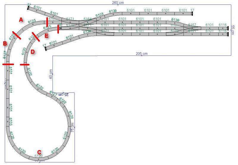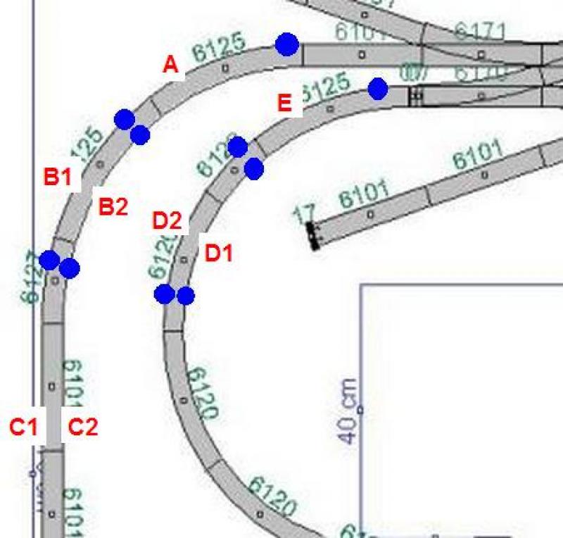De blokken zijn bijna goed. Je kunt echter beter A B D E korter maken en C langer. Het is de bedoeling dat C overeenkomt met de lengte van je stroomafnemende trein. De andere blokken mogen gerust wat korter zijn. Hieronder heb ik 'n plaatje gezet met de isolatie's (blauwe stippen) en de aansluitingen. Die aansluitingen zie je heel duidelijk op de foto blad 16 van Wim's handleiding. Aan de rechterkant zie je een strip met alle railsaansluitingen.