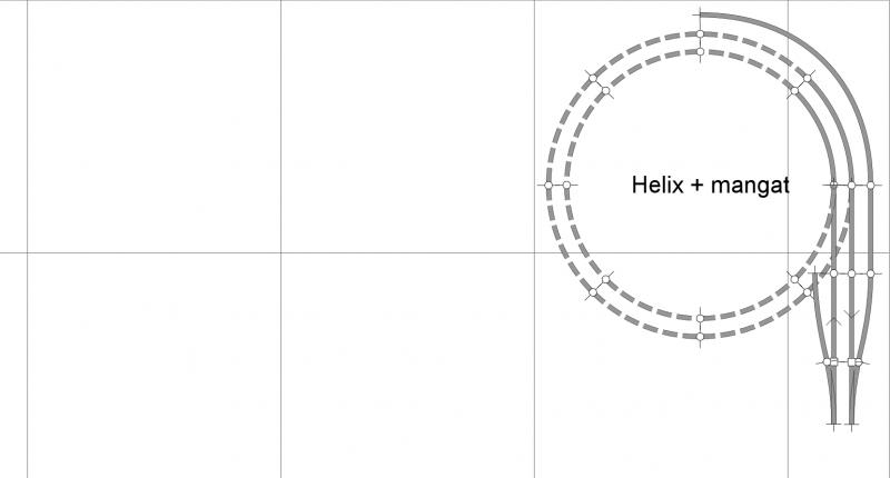 Als je de helix (binnenbocht) uit R2 opbouwt, is de lengte van 1 cirkel relatief kort. Je moet in die ene cirkel wel voldoende klimmen om de trein ruimte te geven tussen de cirkels. Door die korte lengte zou je wel eens een hele steile klim kunnen krijgen. Zonder het precies uitgerekend te hebben, twijfel ik of het wel past.