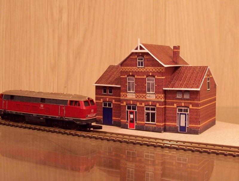 Inmiddels heb ik 3 locs en een stuk of 20 wagons, en wat railmateriaal. Maar aan scenerymateriaal vind ik het aanbod wel heel erg mager in deze schaal. Omdat mijn voorkeur toch uitgaat naar Hollands landschap heb ik besloten de bebouwing zelf te maken: ik heb op de PC een station en diverse huisjes getekend en daar fotografische details in gefotoshopt. Het resultaat is zelf uit te printen, natuurgetrouwe bebouwing.